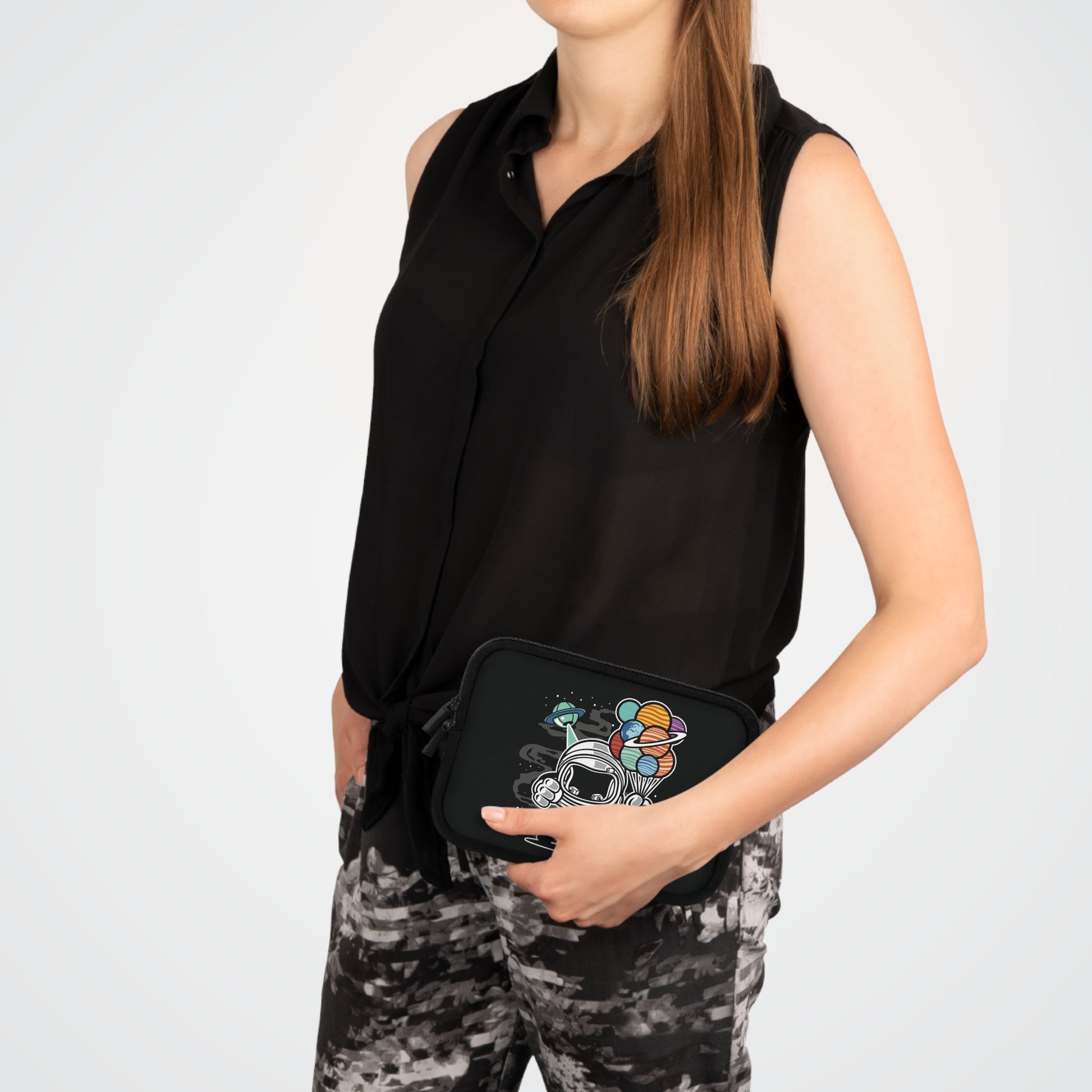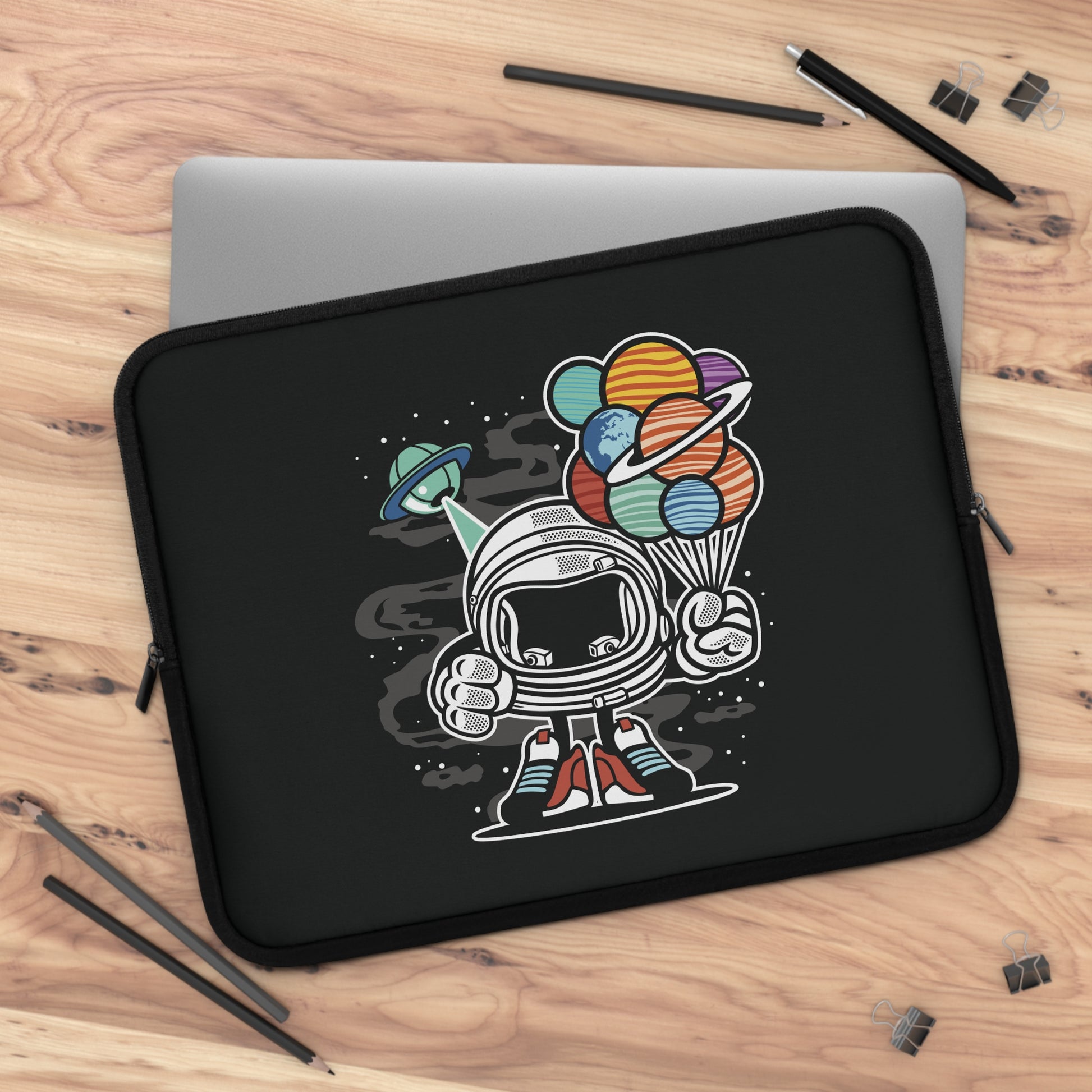 A playful, protective laptop sleeve that brings a little wonder to your daily commute. The smooth neoprene exterior and foam padding keep your device safe from dust, light bumps, and spills while the dual zipper enclosures give quick, secure access. The front showcases a whimsical astronaut holding a bouquet of planetary balloons—bright, quirky artwork that stands out against the solid black back. Lightweight and water resistant, it slips easily into backpacks or messenger bags and feels made for people who carry creativity with their tech. Carry it to classes, co-working spaces, weekend trips, and those late-night study sessions when a little cosmic charm helps keep focus—and mood—up.