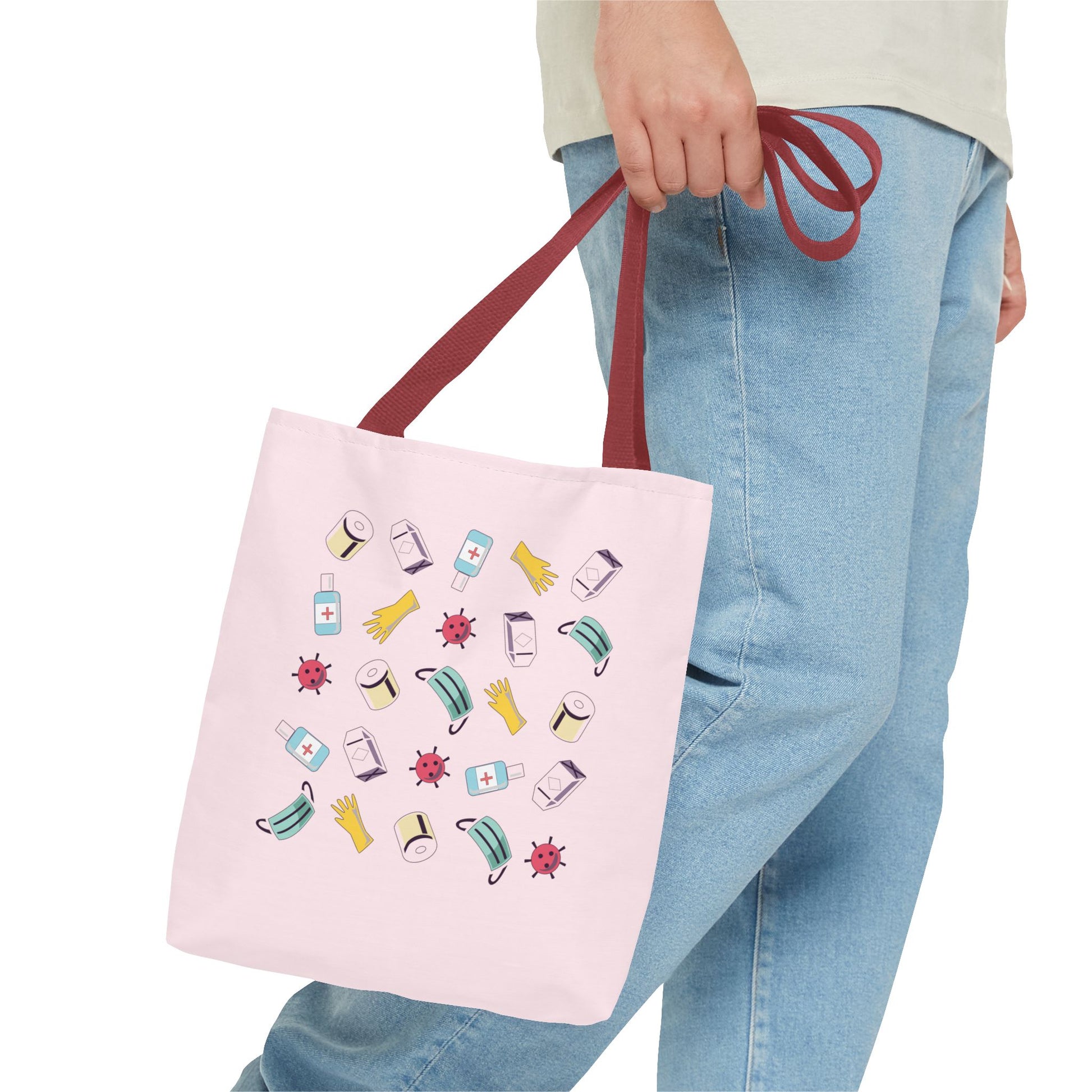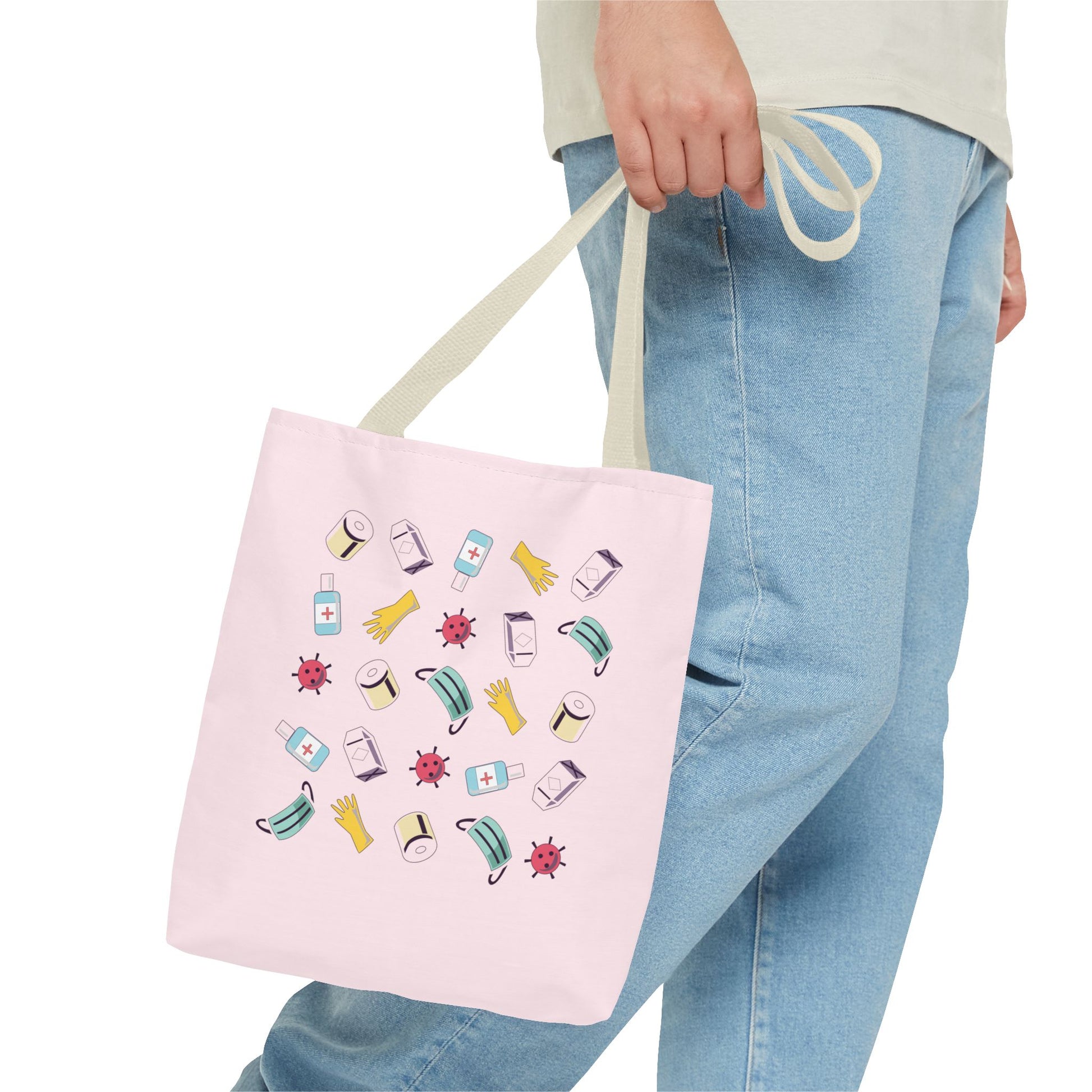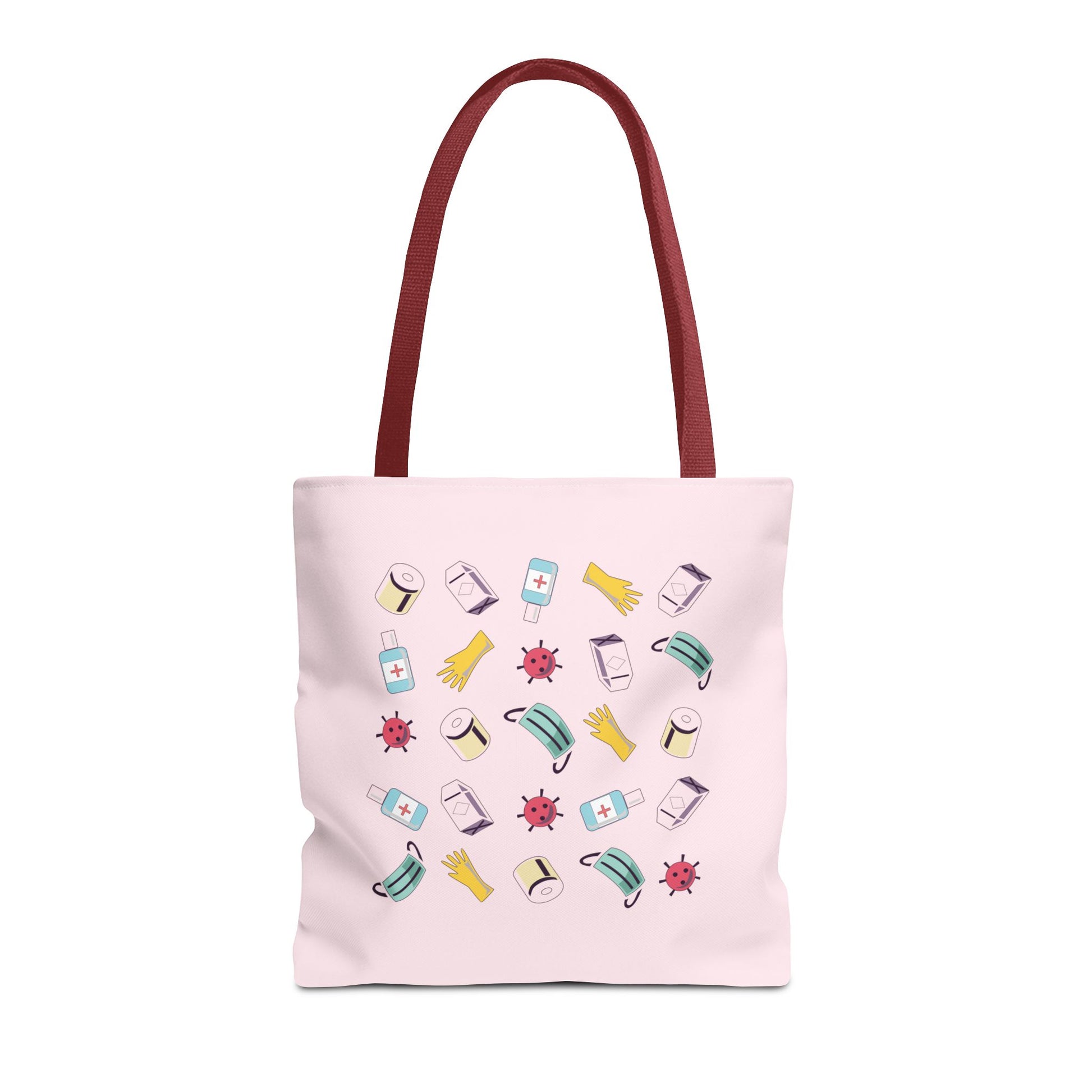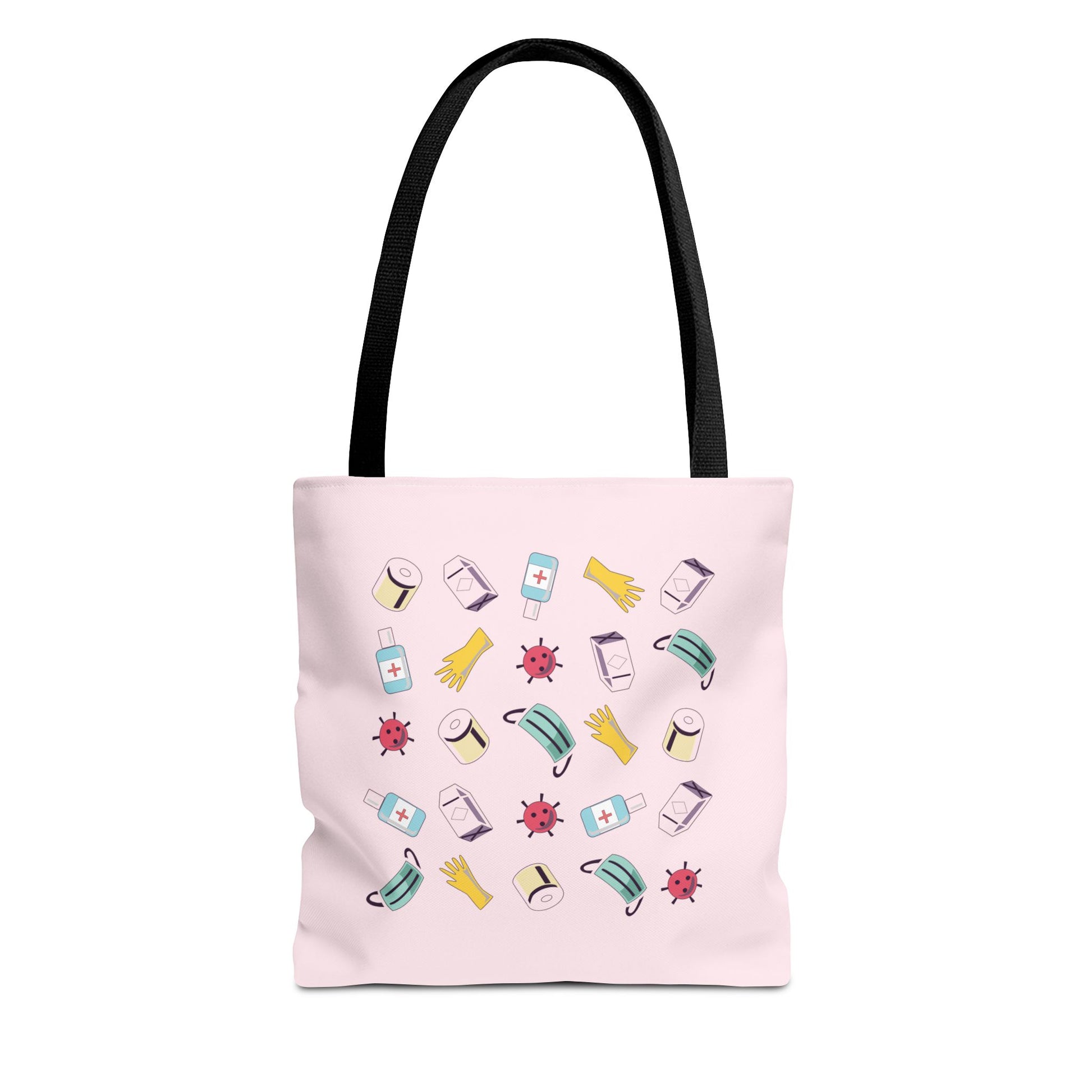 A soft-pink tote with a playful, medicine-themed pattern — pill bottles, bandages, masks, and stylized germs arranged like confetti. Lightweight but sturdy, it carries daily essentials with a cheerful, slightly irreverent charm. The roomy boxed-corner design keeps a laptop or groceries upright, while reinforced handles and seam details stand up to repeat use. This tote feels like a wink to healthcare workers, pharmacy students, or anyone who loves quirky, clinical-inspired prints; it makes everyday runs and shift commutes a bit brighter and more personal.