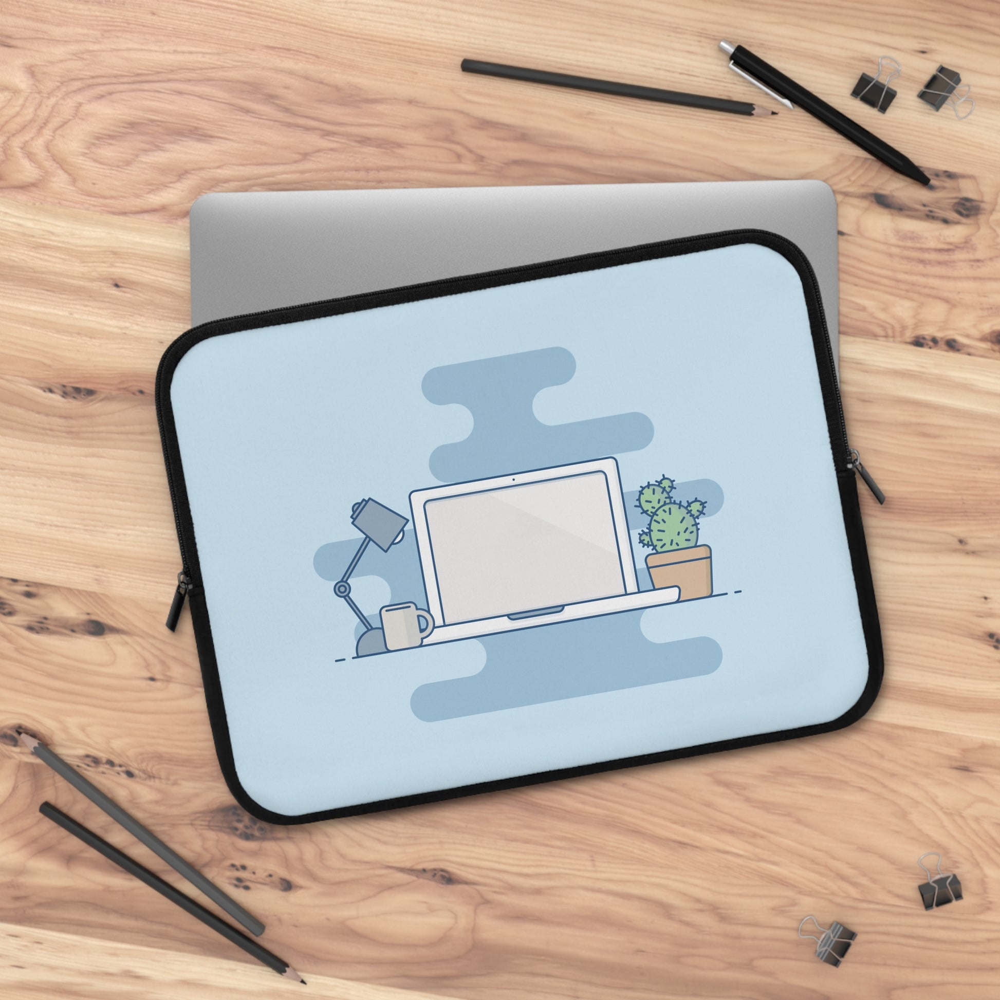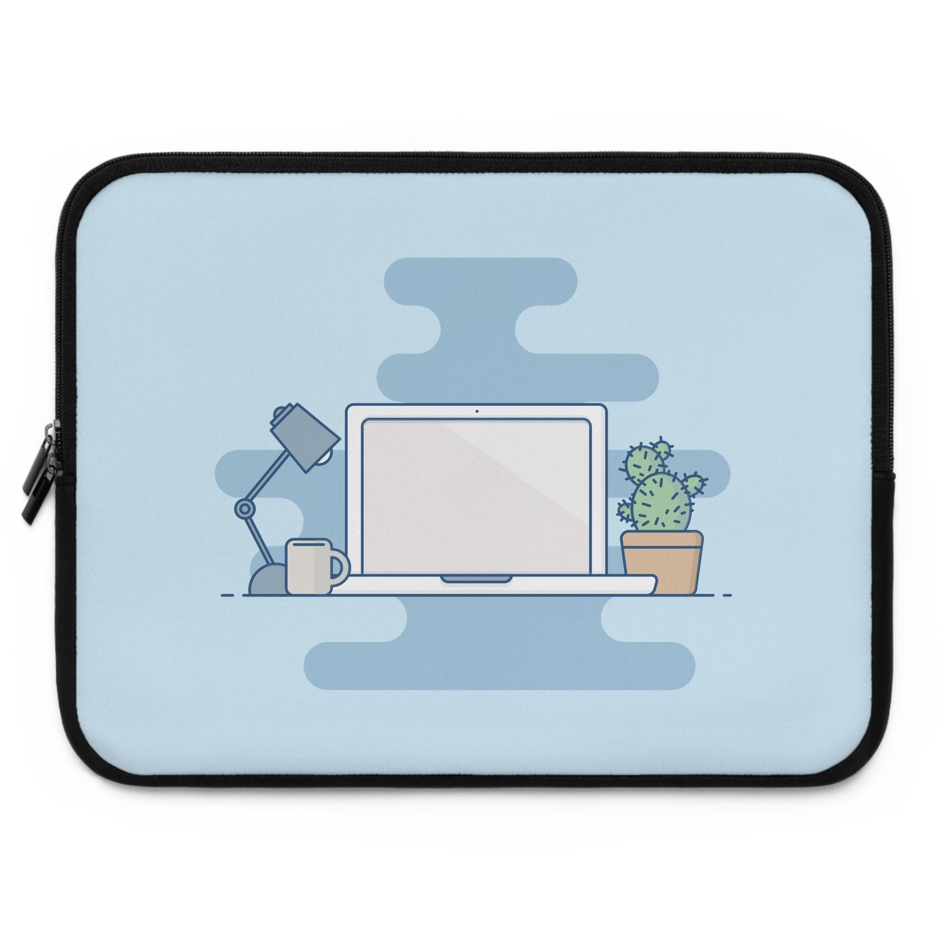 Slide your laptop into a soft, protective sleeve that feels like a little corner of your favorite workspace. The smooth neoprene surface cushions against small bumps and keeps dust at bay, while dual zippers glide easily so you can grab your device in a hurry. The front shows a calm, minimalist desk scene—lamp, coffee mug, laptop, and a small cactus—on a pale background that brightens your bag. The back is solid black for a low-profile carry. Lightweight and water-resistant, this sleeve moves with you from cafe table to home office, keeping your laptop safe and looking quietly curated.