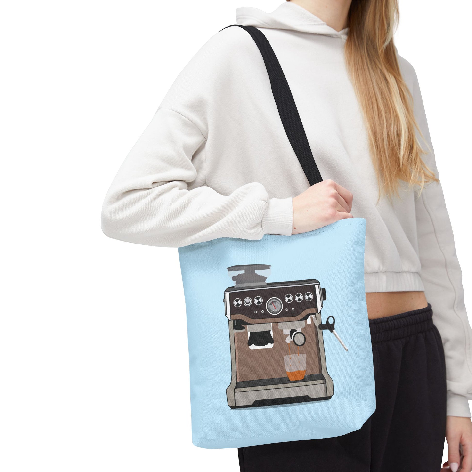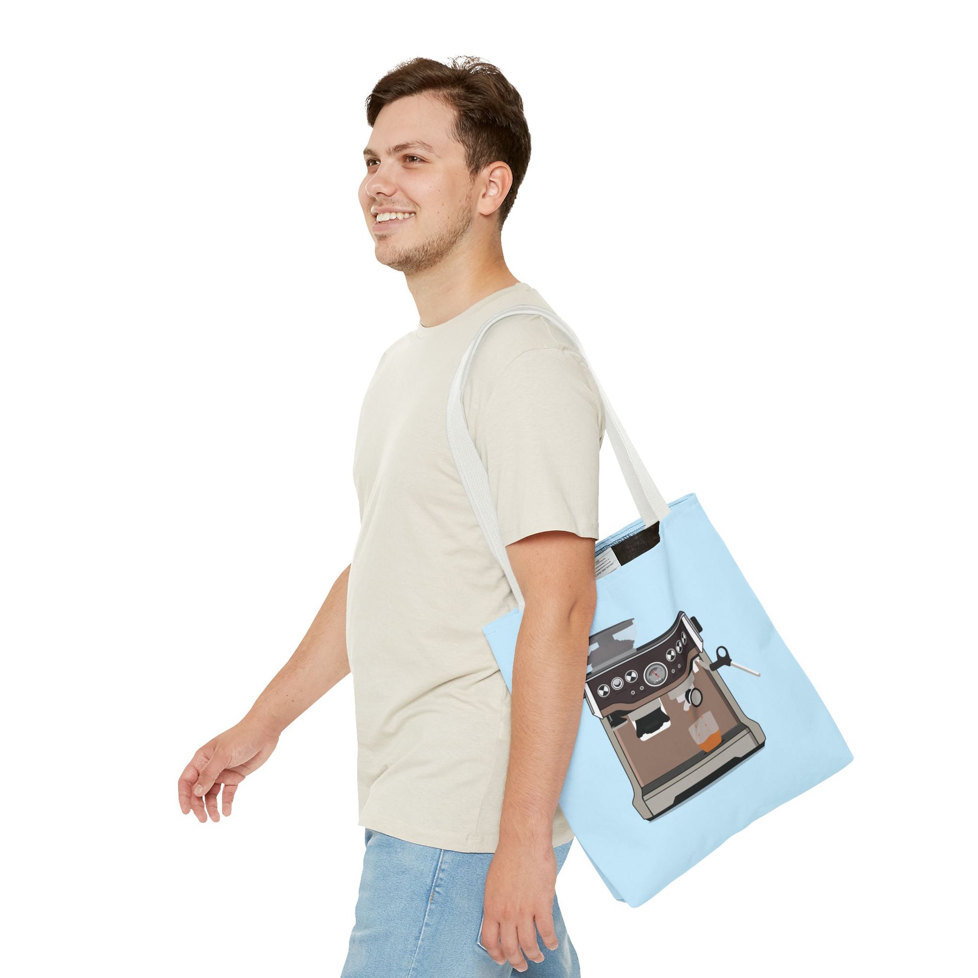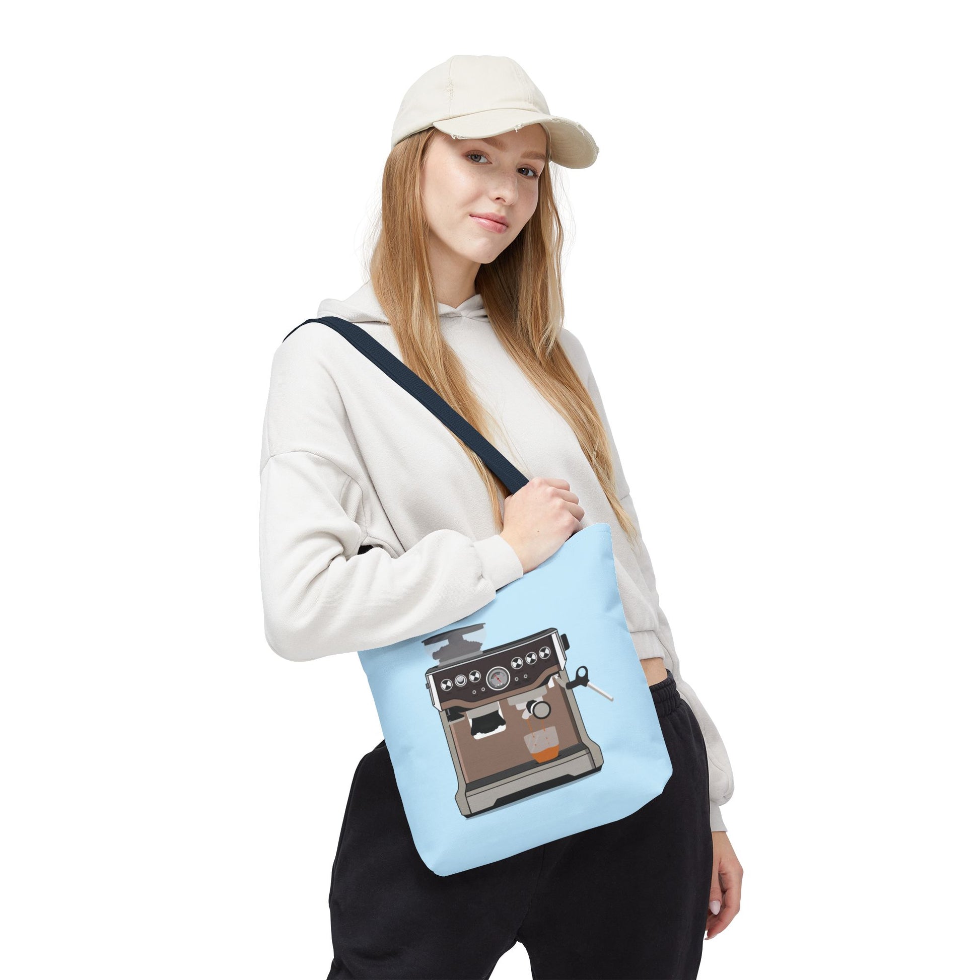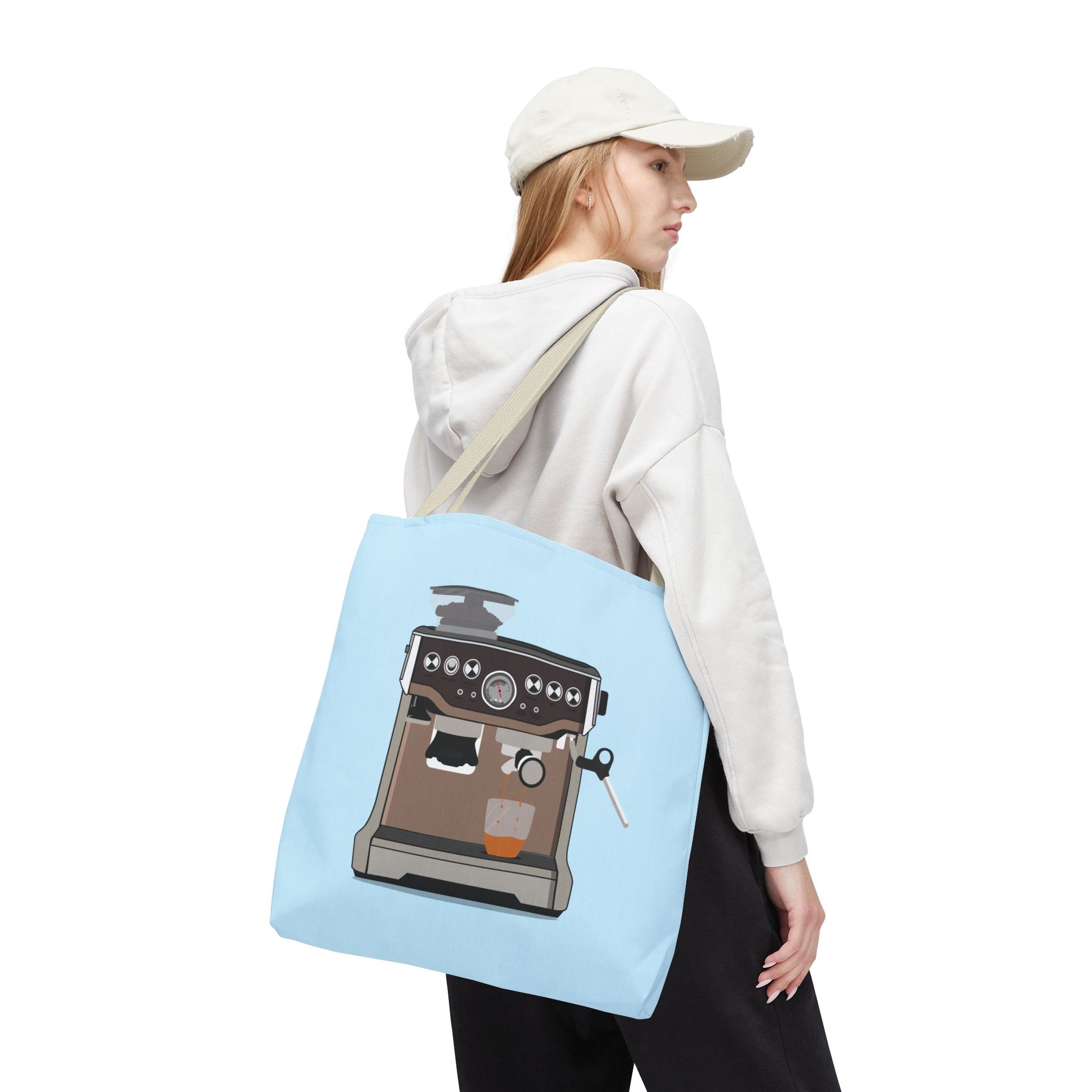 This roomy polyester tote brings your love of espresso culture with you — a soft sky-blue canvas printed front and a stylized espresso machine illustration that feels warm and deliberate. It carries morning rituals, stash for cafe runs, and the little extras: a creamer, a favourite mug, a notebook where you sketch latte art ideas. The boxed corners give it shape and capacity; reinforced handles and seam details mean it takes daily wear without losing form. Lightweight but sturdy, it slips over your shoulder with comfortable cotton handles in five color choices to match your mood or your travel mug. Bring a touch of the coffee bar to errands, classes, or a slow weekend market stroll.