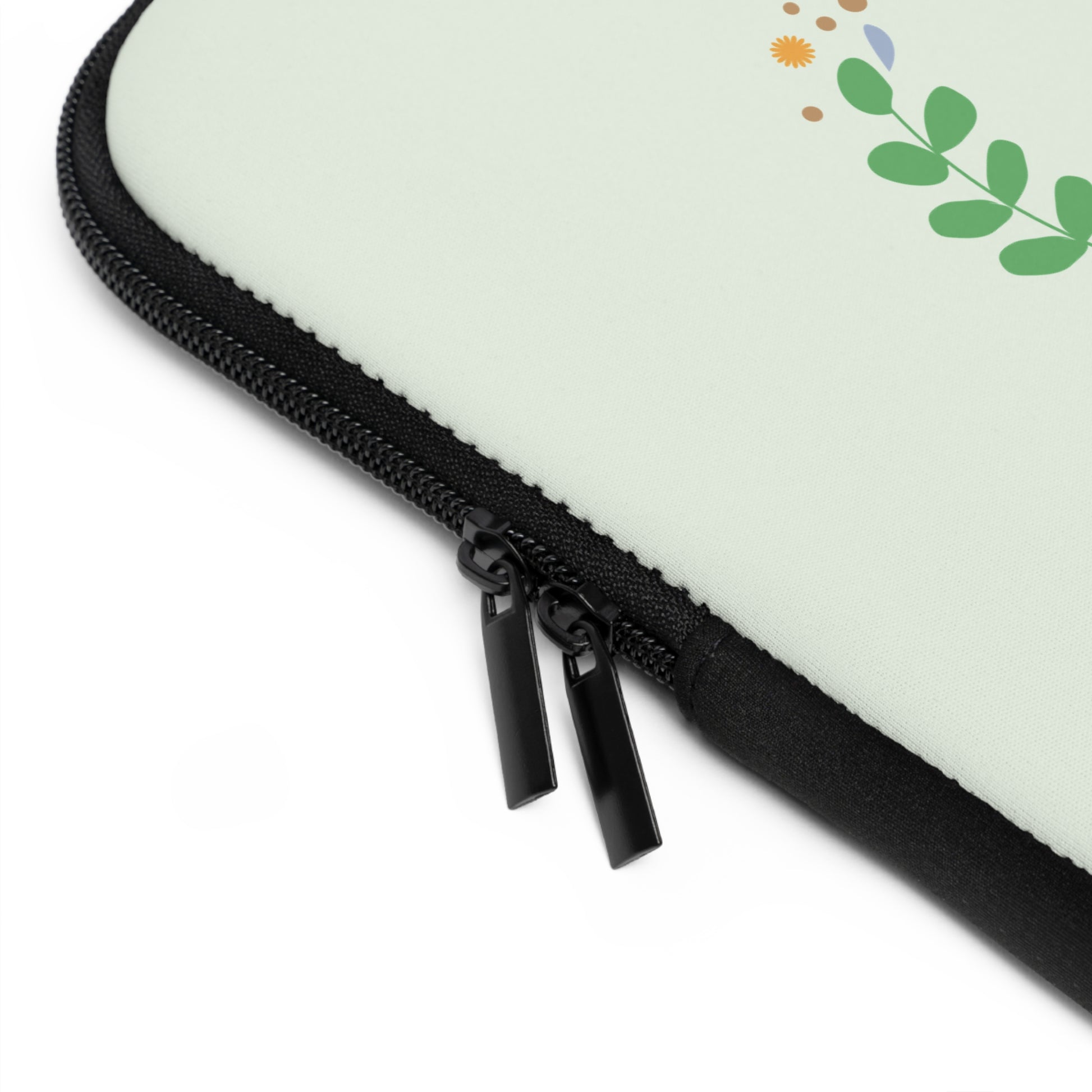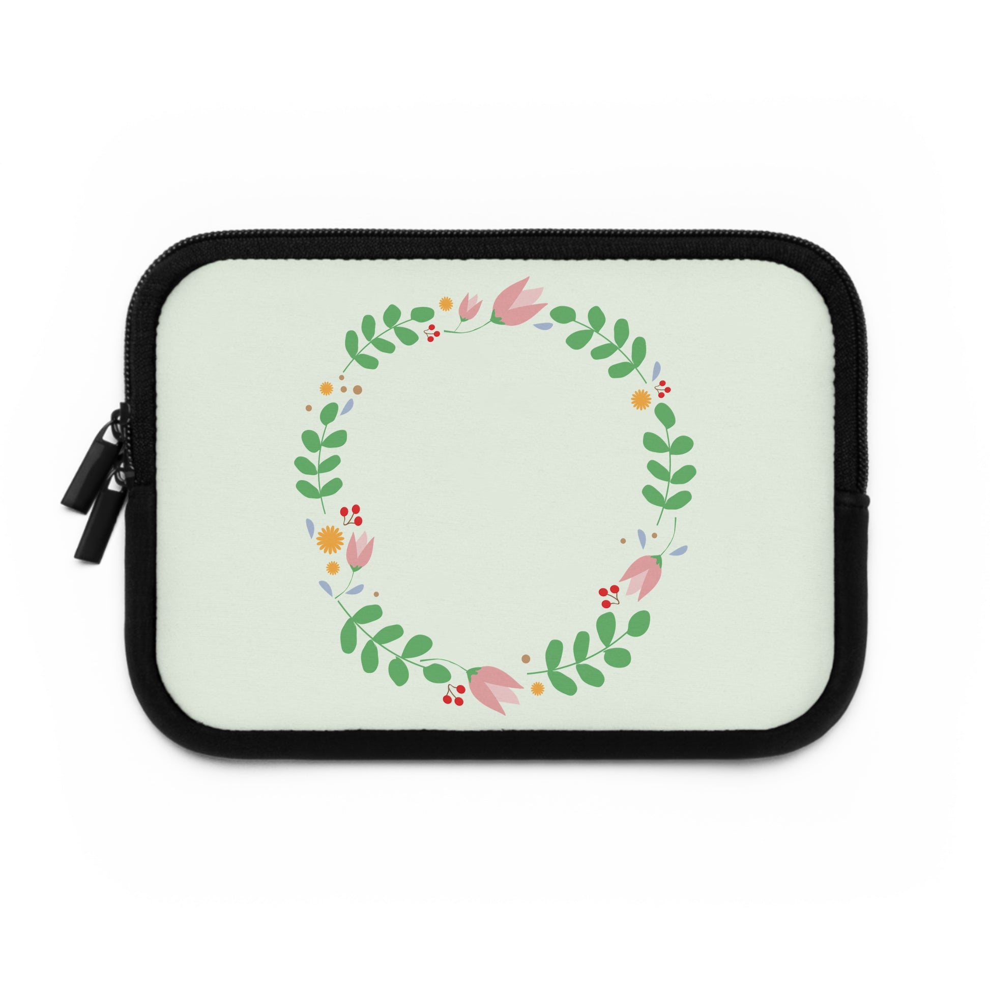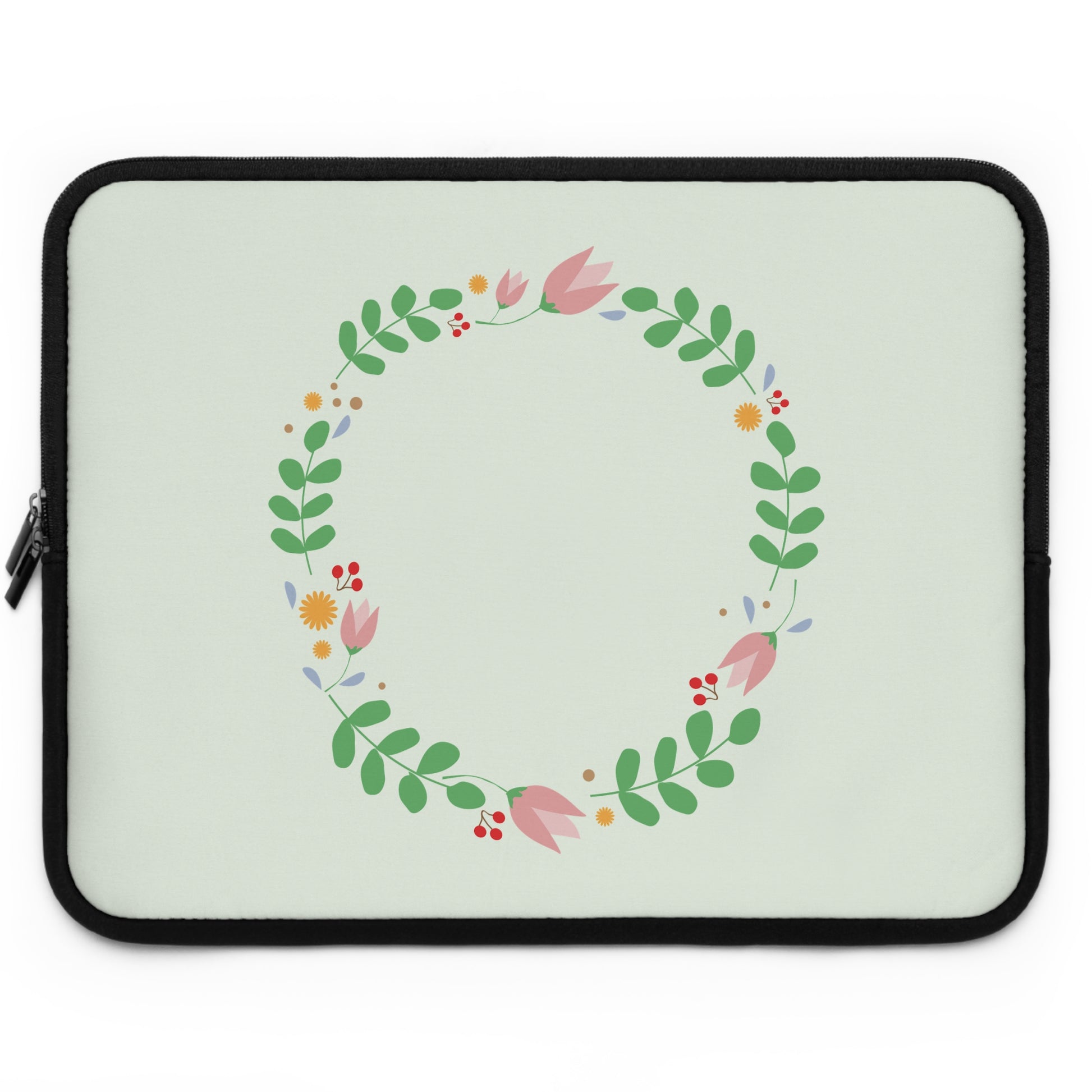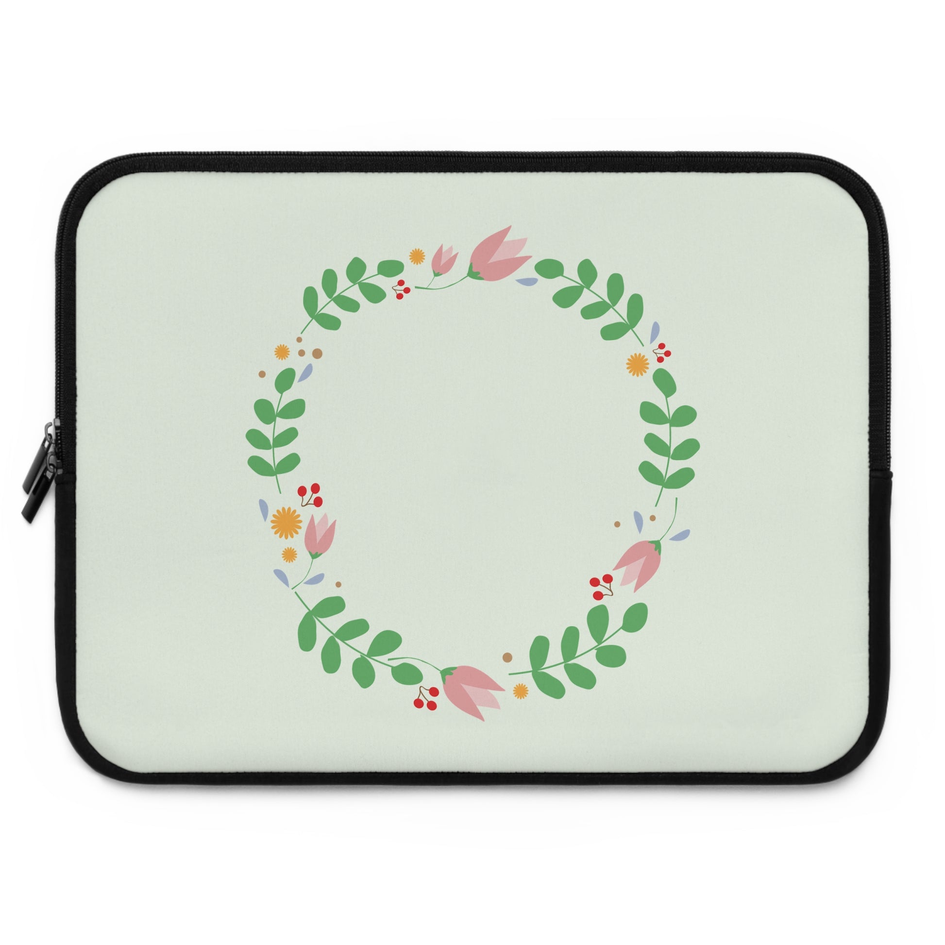 A soft neoprene laptop sleeve that brings a gentle, hand-painted touch to your daily carry. The front features a delicate floral wreath in pastel greens, pinks, and tiny berries set against a pale mint background. Inside, foam padding cushions your device from small bumps and dust while the water-resistant exterior protects against light spills. Dual zipper enclosures glide smoothly so you can grab your laptop on the move, and the solid black back keeps the look clean and low-profile. Lightweight and available in multiple sizes, this sleeve slides easily into a tote or backpack and adds a quiet, thoughtful accent to everyday tech.