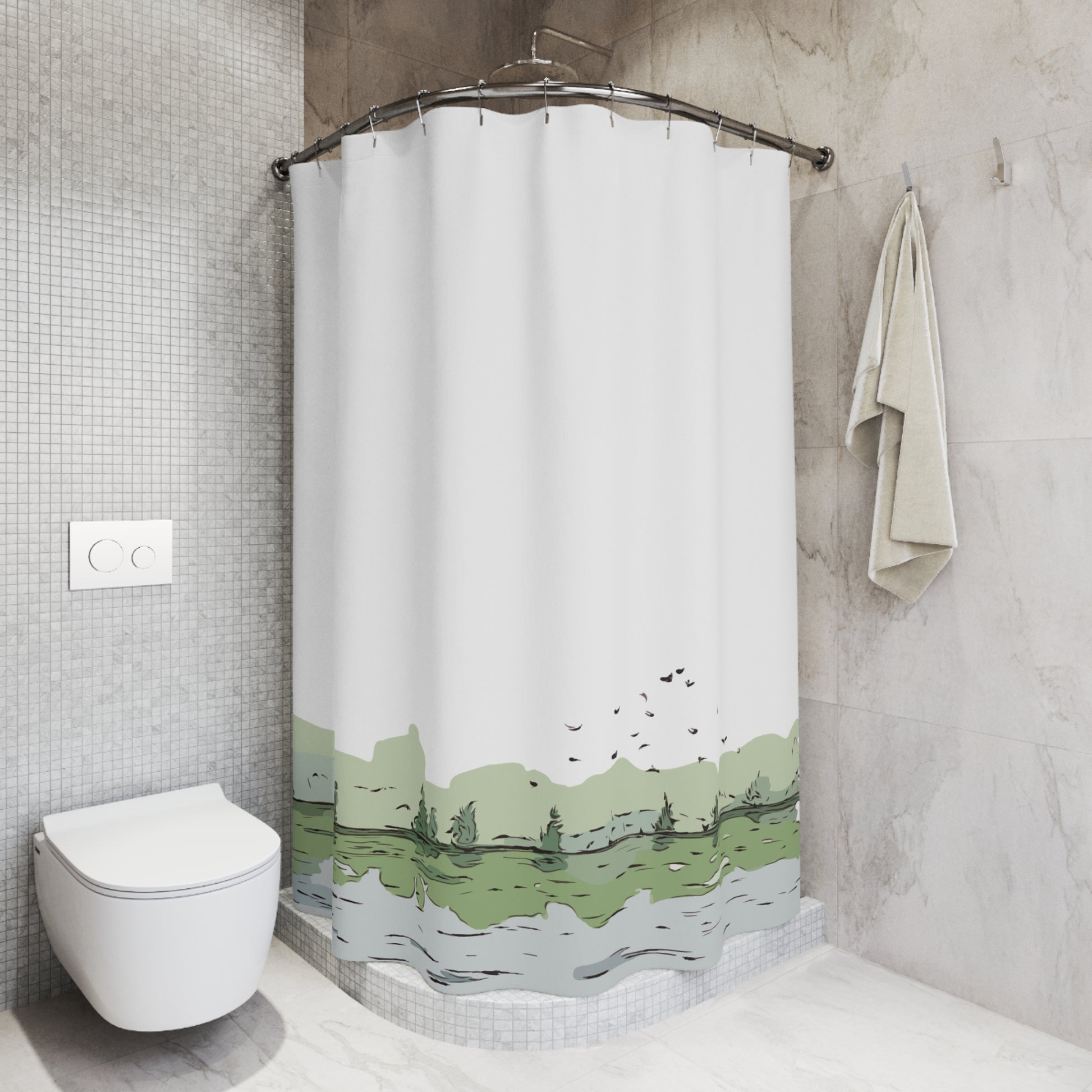 Bring a calm, lakeside morning into your bathroom with this lightweight polyester shower curtain. Soft, painterly greens and muted grays form a low-contrast landscape along the lower edge, like mist lifting off a quiet shore. The design leaves plenty of white space above, giving a fresh, airy feeling that makes small bathrooms feel more open. Durable polyester resists wrinkles and dries quickly, while the pre-constructed top with 12 buttonholes lets you use your favorite hooks to hang it in moments. It’s adult-oriented, subtly decorative, and suited to anyone who prefers understated nature-inspired decor — imagine stepping into a warm shower and feeling briefly transported to a peaceful retreat by the water.