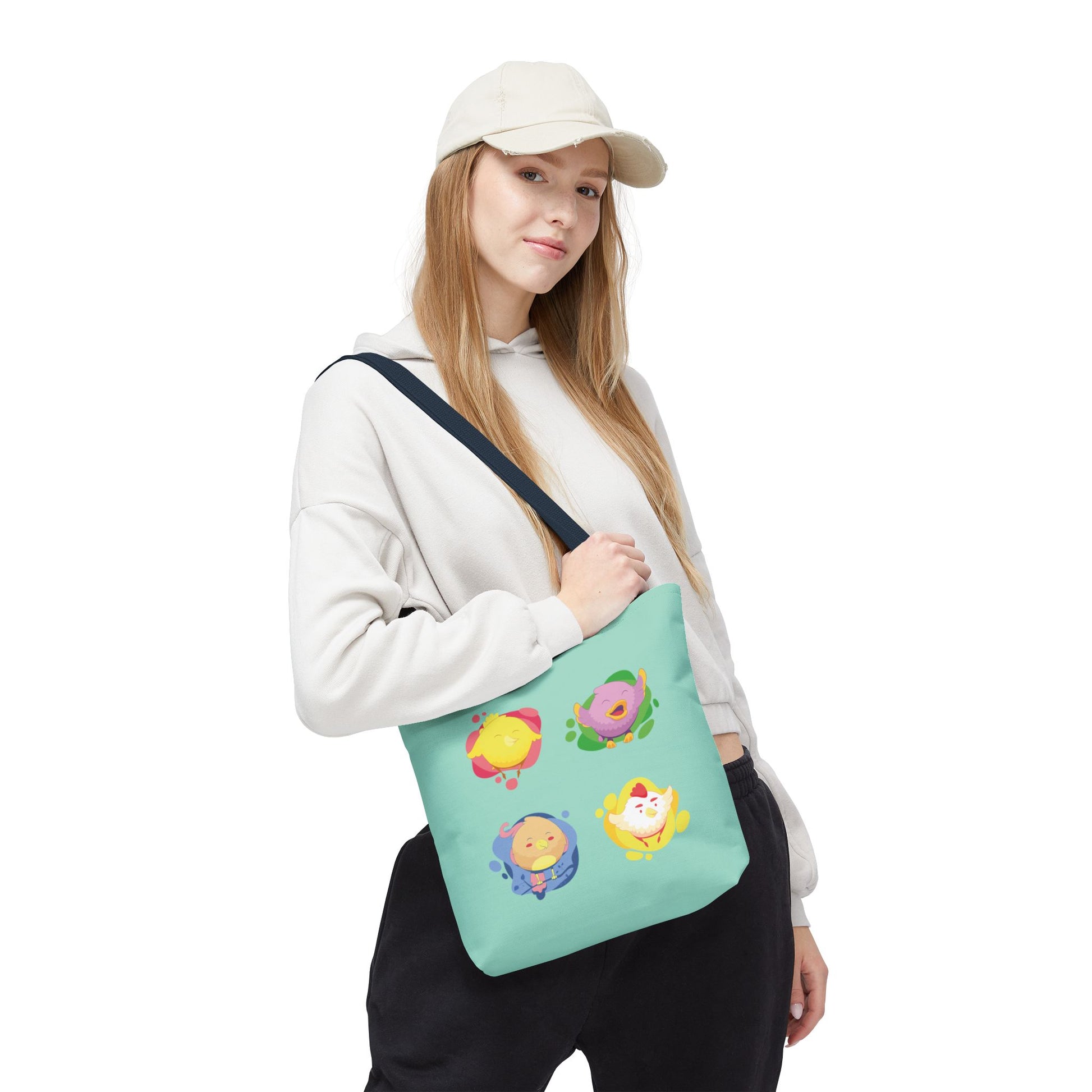 A bright, cheerful tote that carries everyday essentials with a playful twist. The mint background and four whimsical character illustrations bring a lighthearted, kawaii energy—small creatures in soft pastels that peek out like stickers on a friend’s notebook. Lightweight but sturdy, the bag holds its shape while giving you room to tuck in a book, snacks, and a reusable water bottle. The black handles and reinforced stitching mean you can sling it over your shoulder and go, whether you’re wandering a farmer’s market, heading to a coffee shop, or packing for a casual day trip. This tote belongs to people who like color, charm, and a little bit of delight in their daily routines.