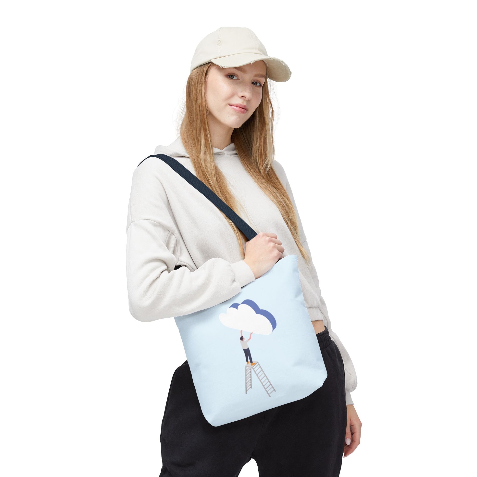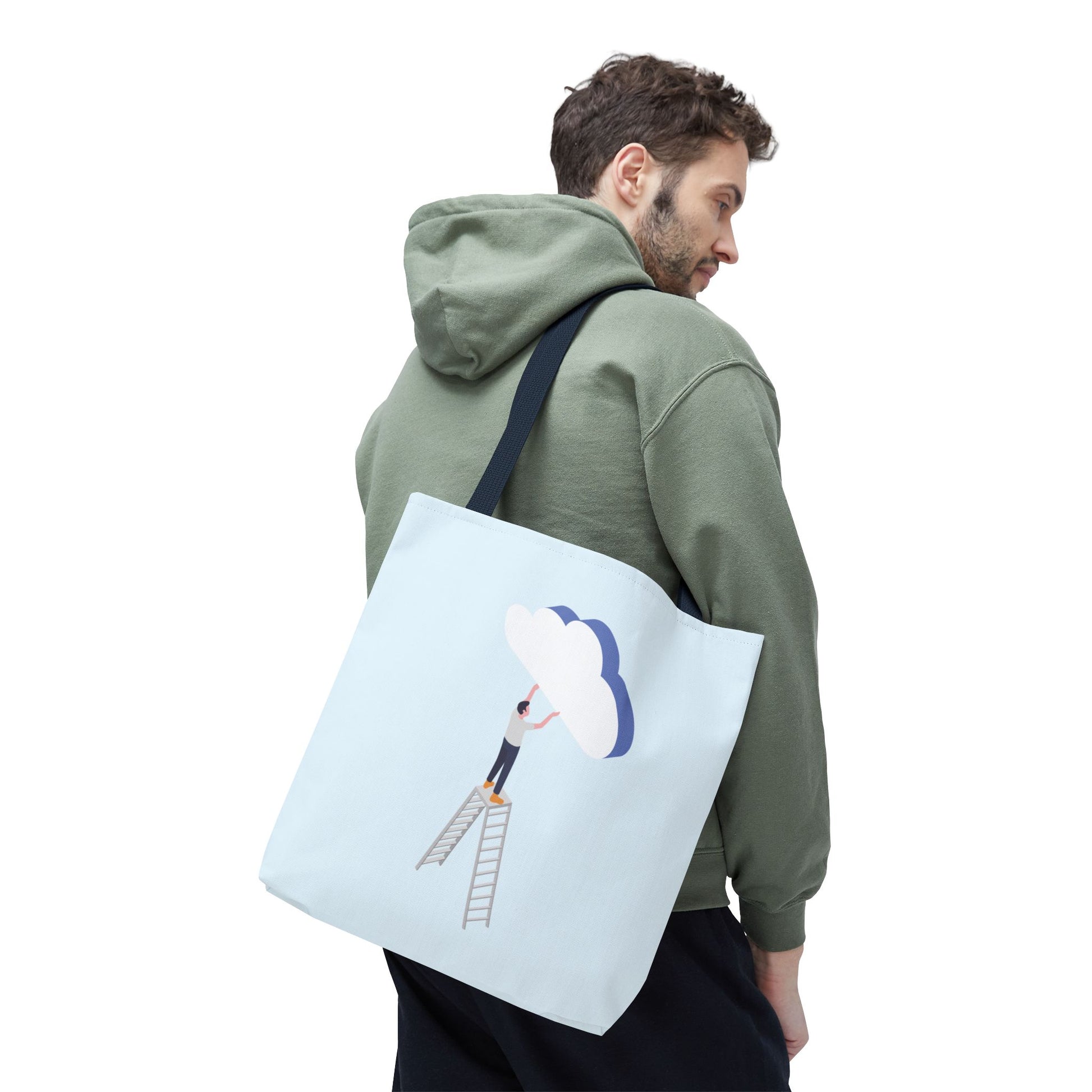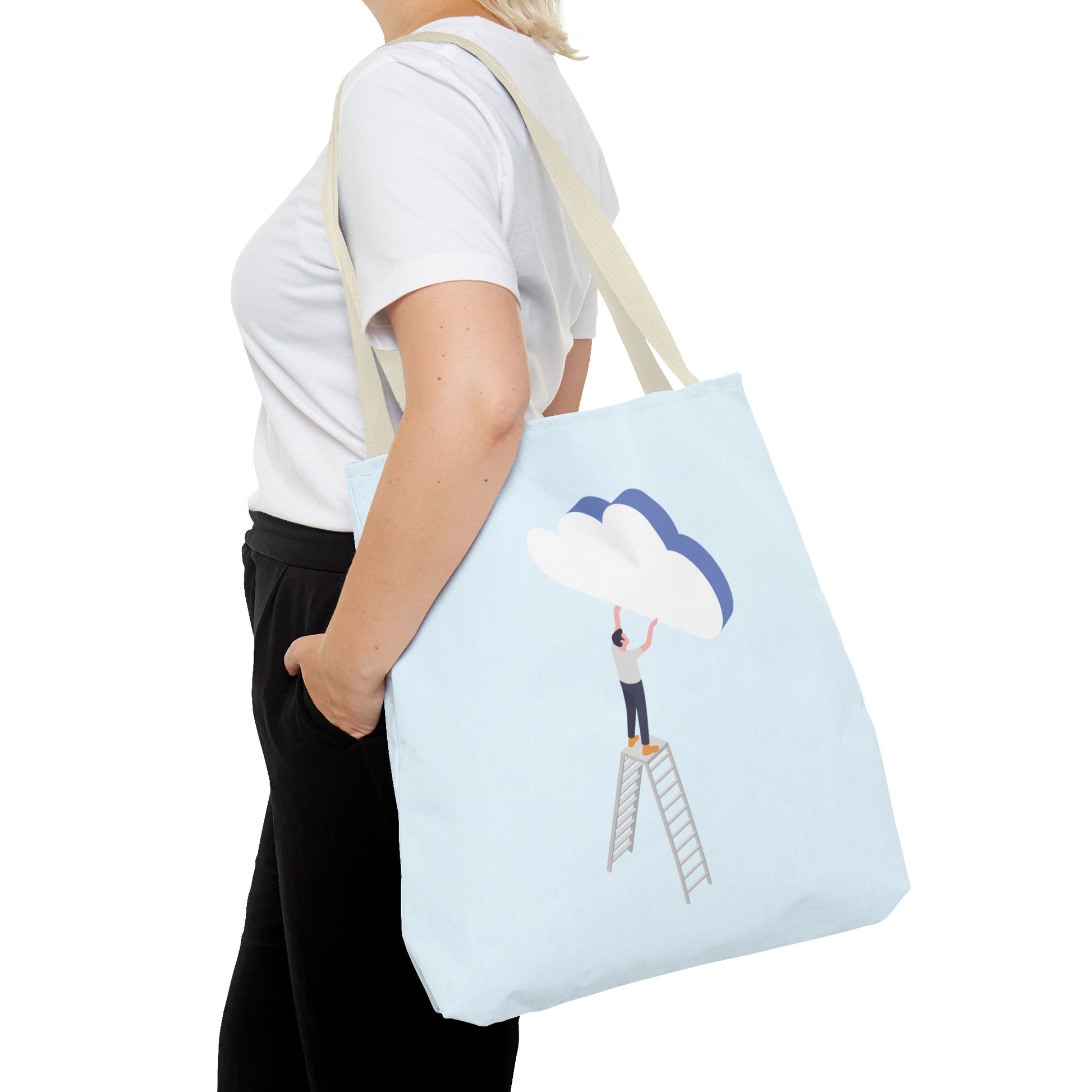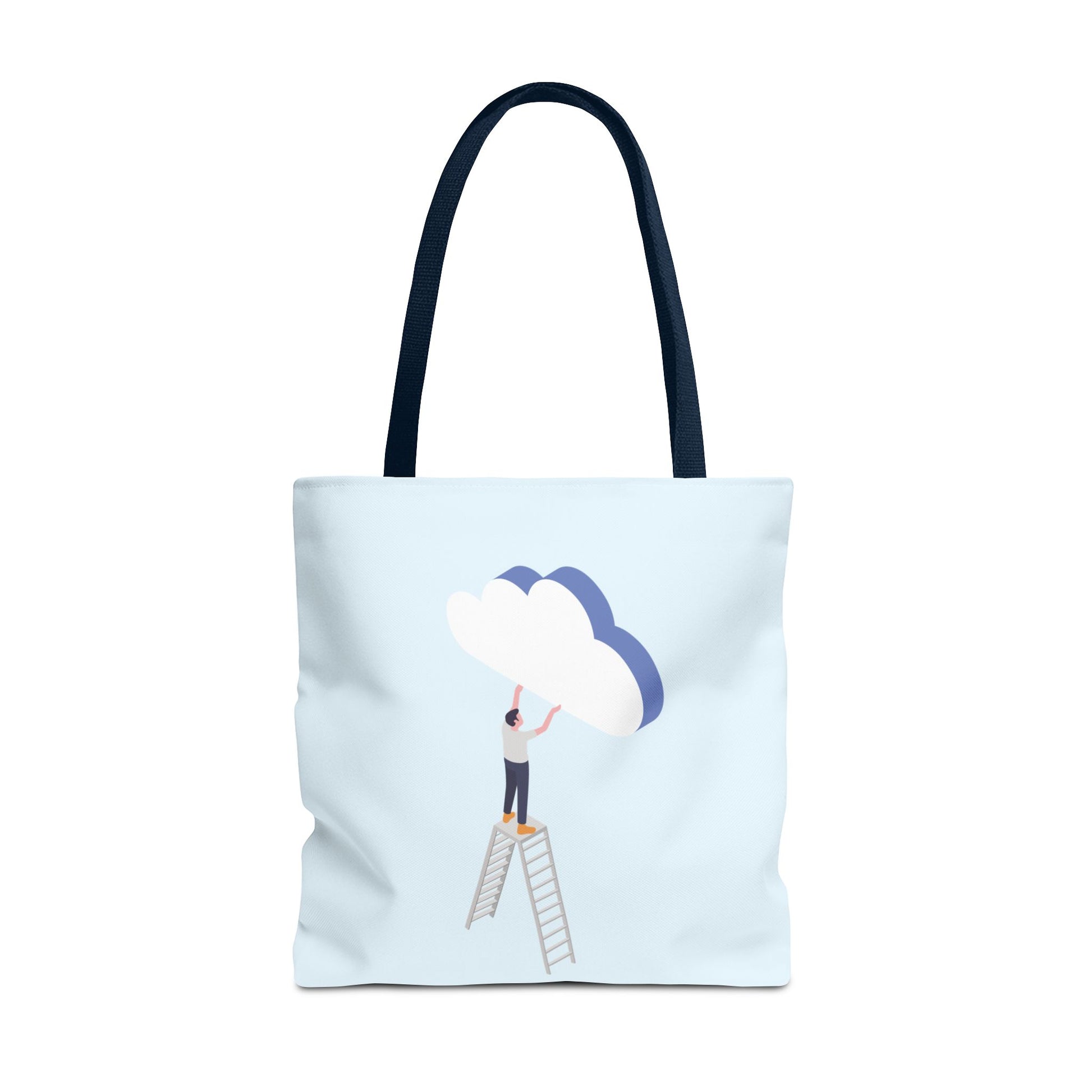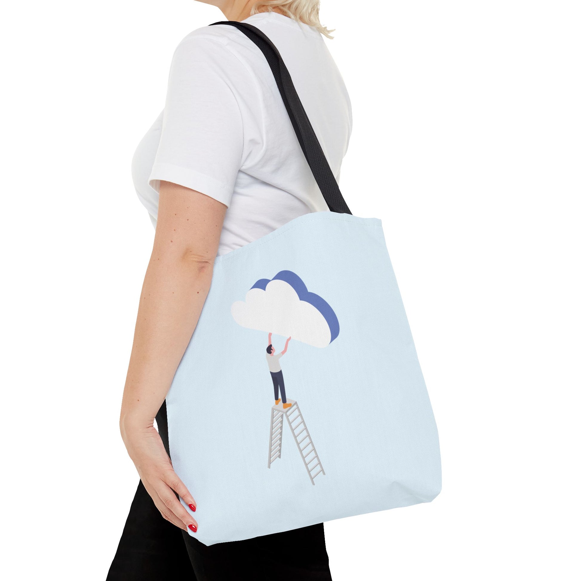 A light, airy tote that feels like carrying a small daydream. Soft sky-blue fabric holds a minimalist illustration of a person on a ladder, gently placing a layered cloud — a quiet nod to slow ambitions, creative moments, and hopeful mornings. The roomy boxed corners and reinforced handles stand up to daily use, while the smooth, laminated interior keeps contents neat. Bring it to studio sessions, farmers’ markets, or library afternoons — it sits comfortably on your shoulder and keeps your essentials within reach without stealing the scene.