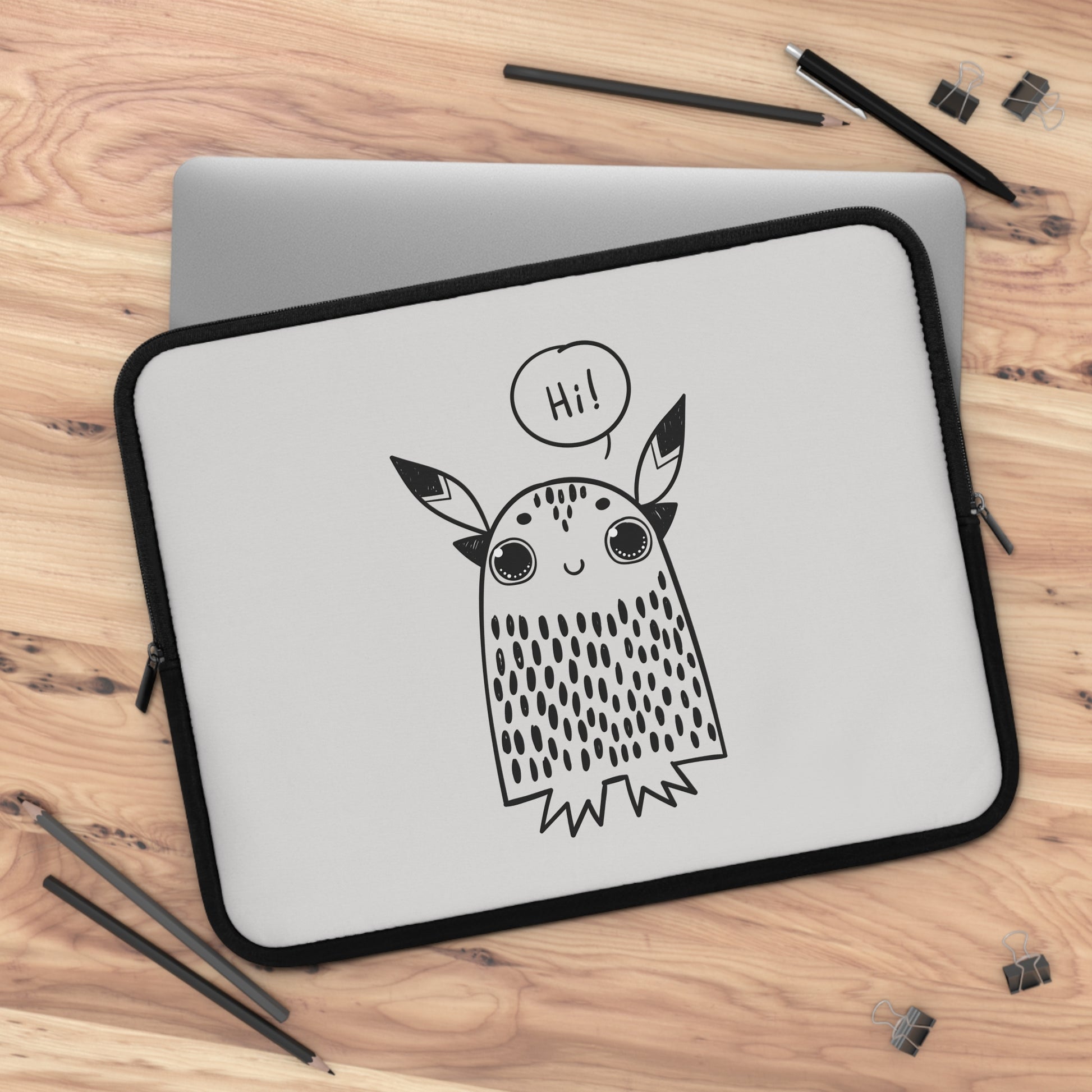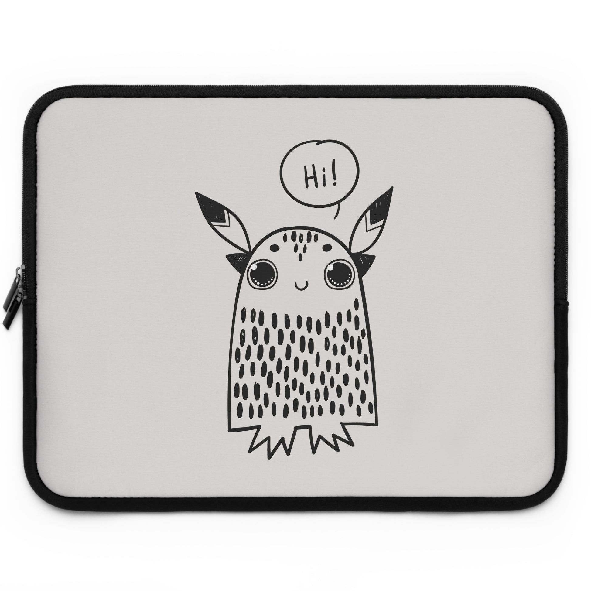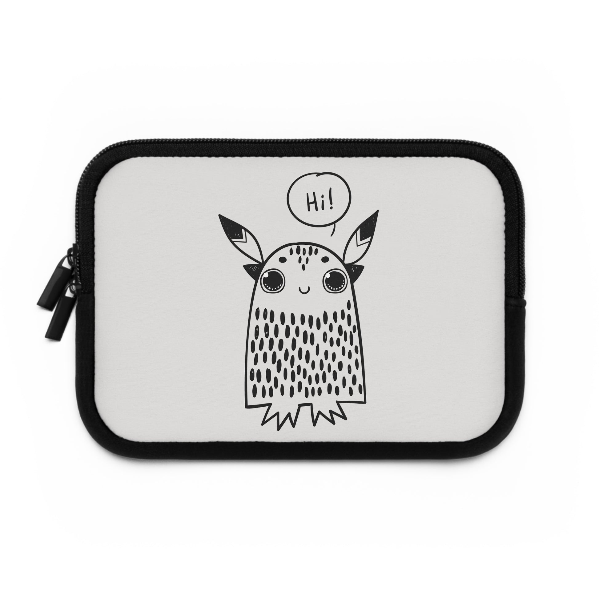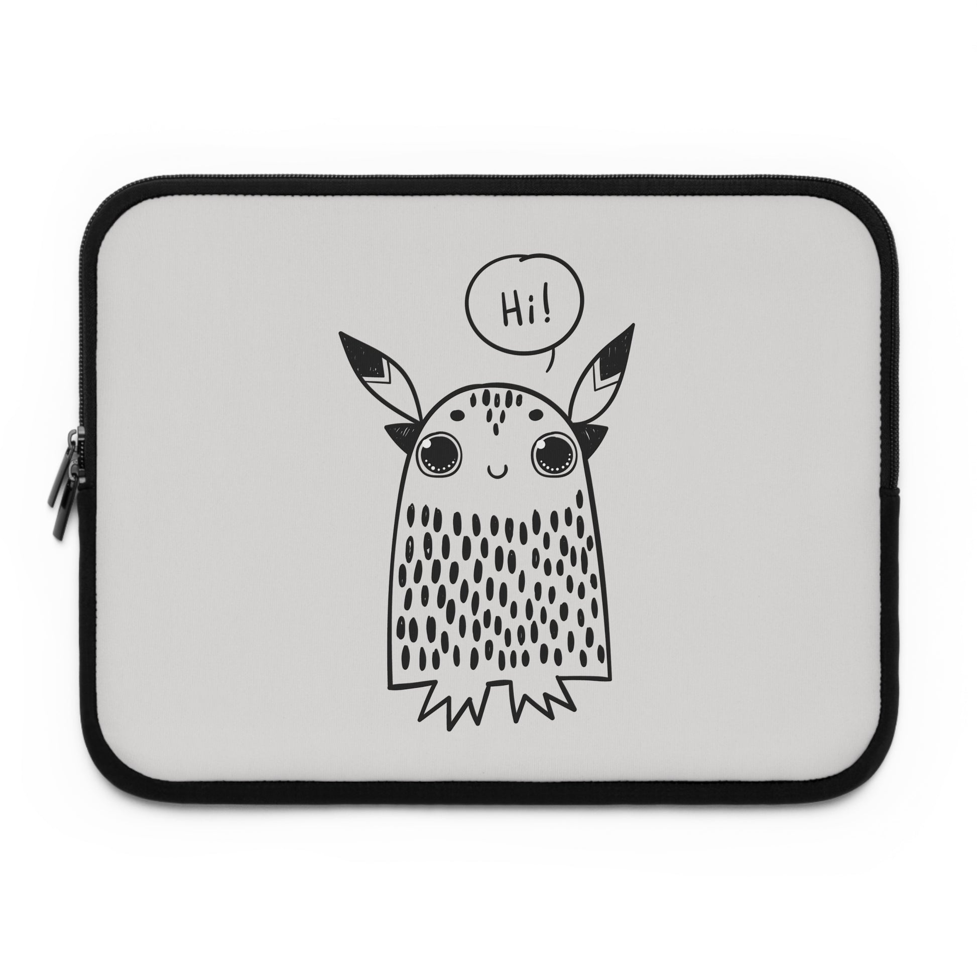 This neoprene laptop sleeve carries a playful, hand-drawn spirit—an approachable little creature waves “Hi!” from the front, bringing a warm smile to your daily commute or study session. Lightweight yet cushioned, the sleeve’s foam padding soaks up the small bumps of everyday life while the water-resistant neoprene keeps spills and dust at bay. Dual zipper enclosures open smoothly for quick access, and the solid black back keeps the look clean and low-key. Available in multiple sizes, it slips easily into backpacks or briefcases and adds a touch of personality without getting in the way.