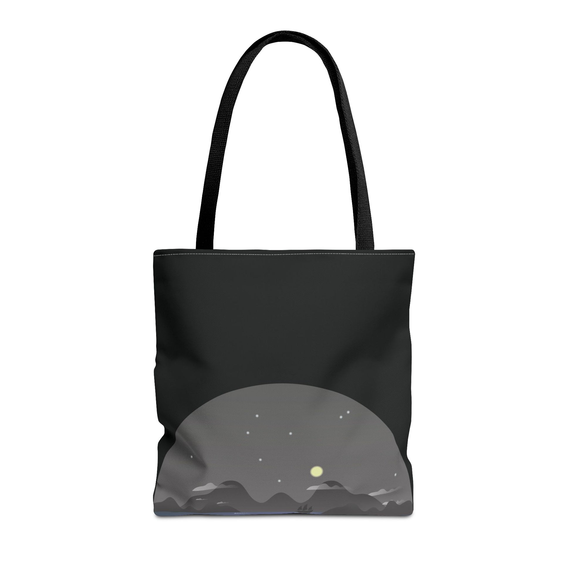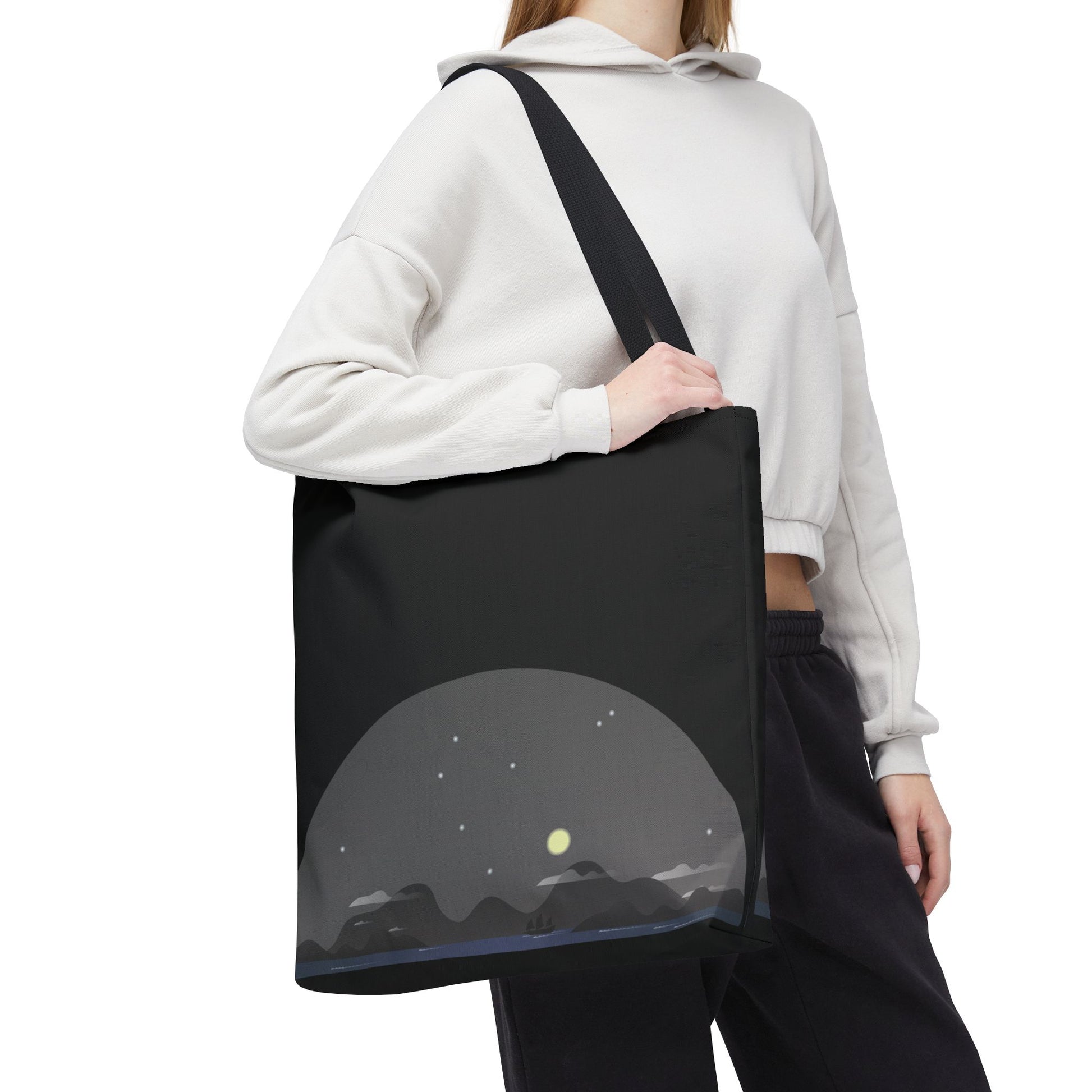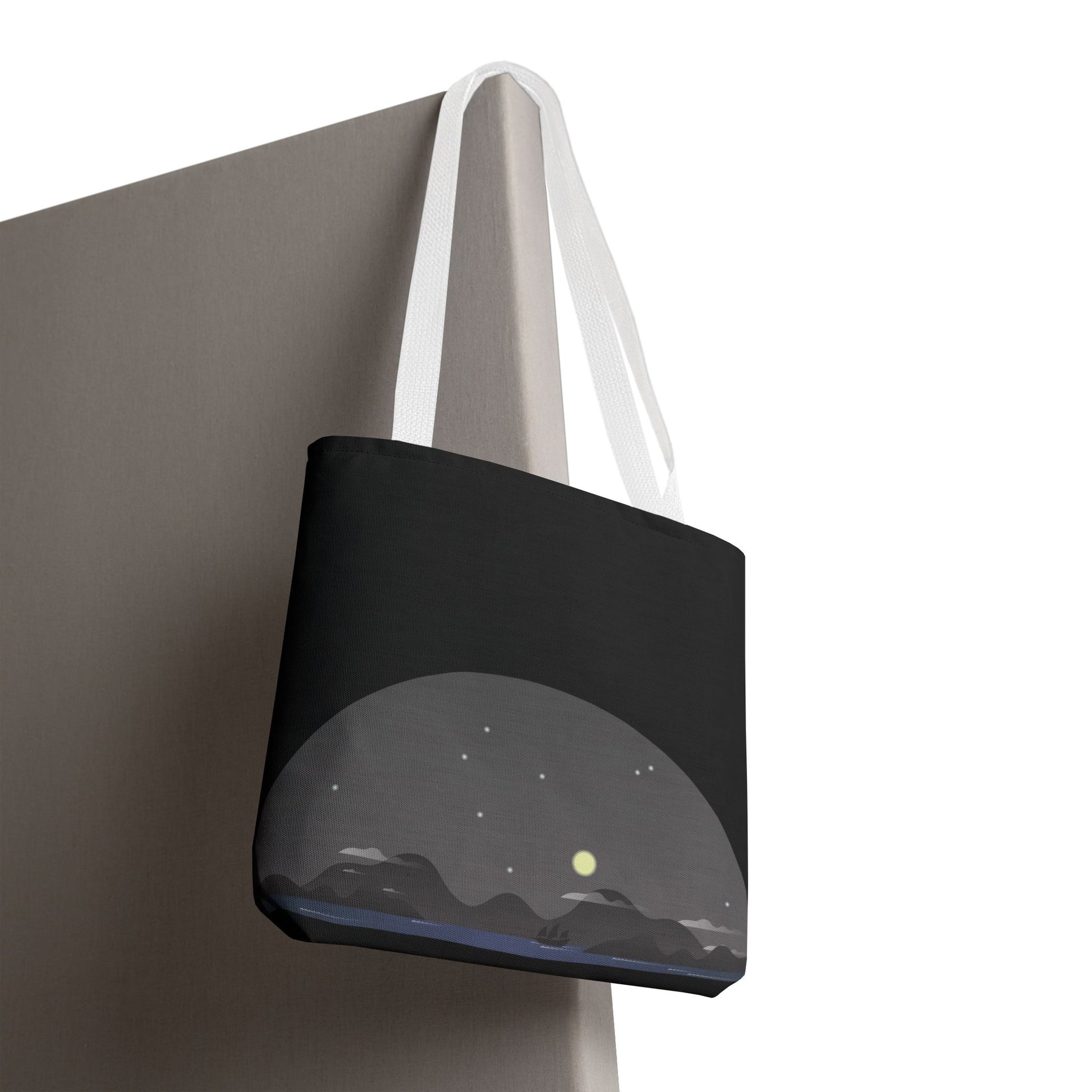 Soft dusk settles over a quiet stretch of hills—stars blinking awake as a pale moon lifts above the ridgeline. This tote carries that same hush: dark, minimal, and quietly expressive. Slide it over your shoulder on evening walks, toss groceries inside after a farmers’ market run, or use it to hold sketchbooks and a thermos for a roadside stop. The muted palette and low-profile landscape print blend easily with layers and denim, giving you a subtle, introspective accent rather than shouting for attention. It’s for people who move through city nights and country roads with the same mellow, observant pace.