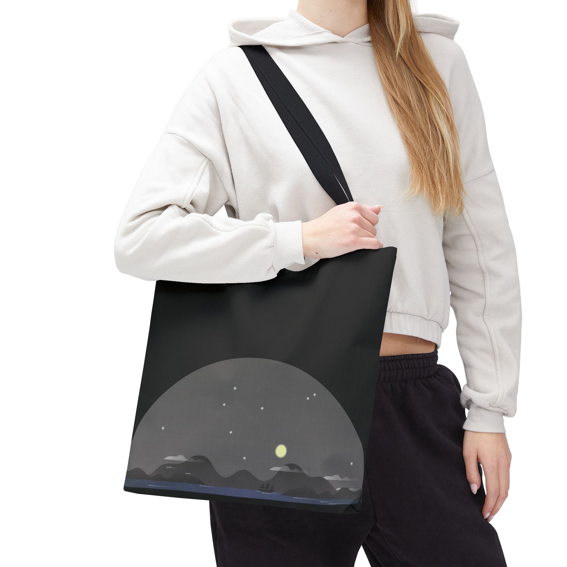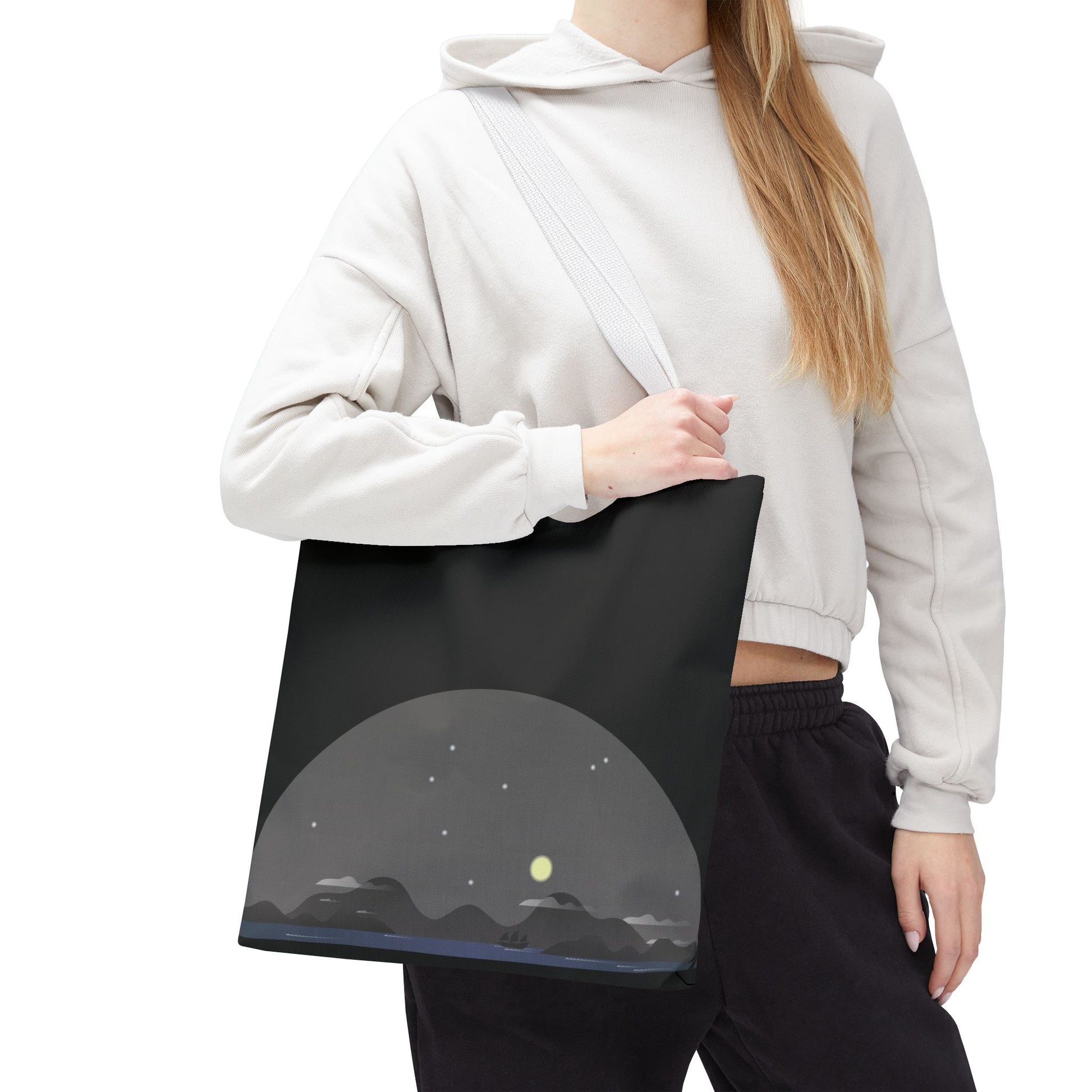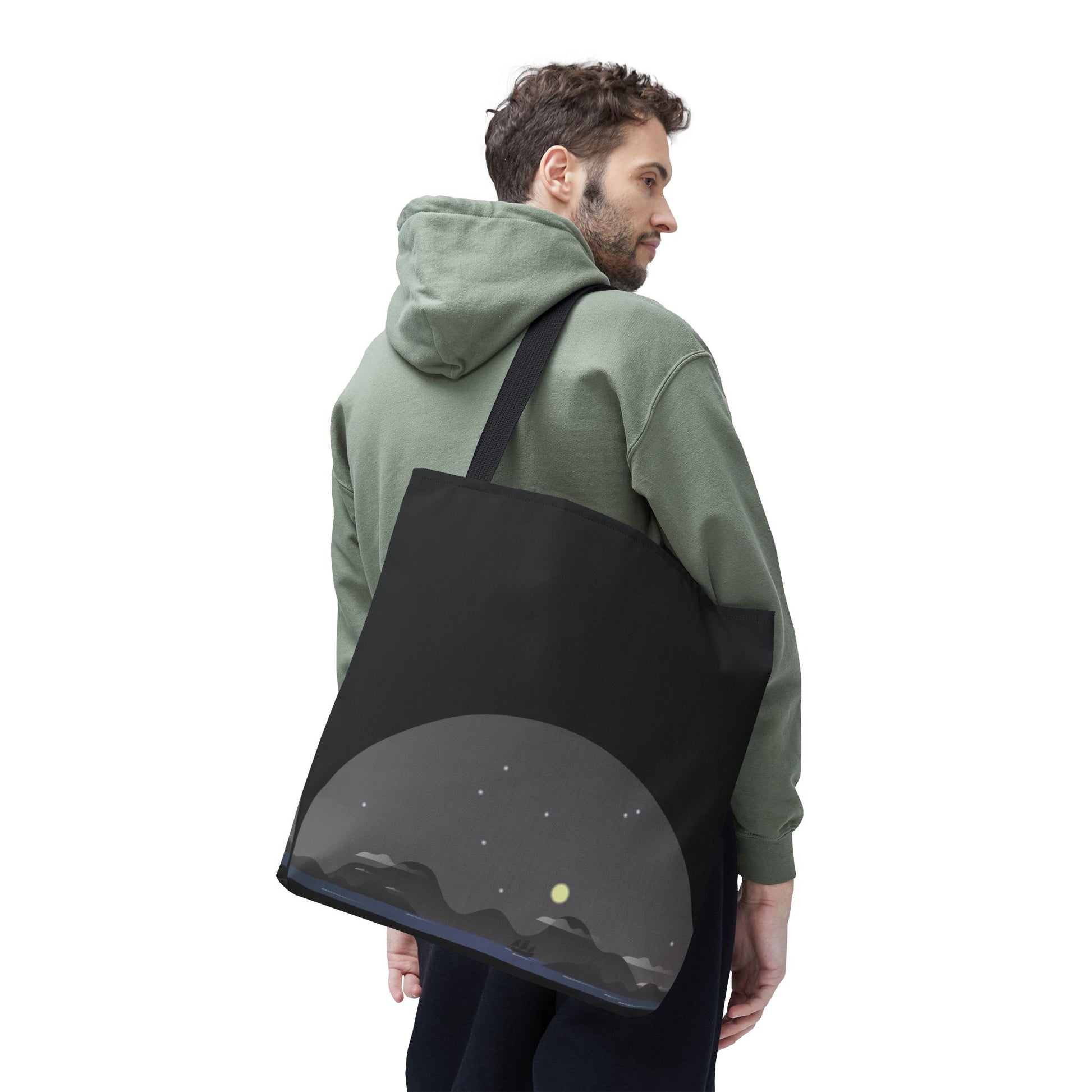 Soft dusk settles over a quiet stretch of hills—stars blinking awake as a pale moon lifts above the ridgeline. This tote carries that same hush: dark, minimal, and quietly expressive. Slide it over your shoulder on evening walks, toss groceries inside after a farmers’ market run, or use it to hold sketchbooks and a thermos for a roadside stop. The muted palette and low-profile landscape print blend easily with layers and denim, giving you a subtle, introspective accent rather than shouting for attention. It’s for people who move through city nights and country roads with the same mellow, observant pace.