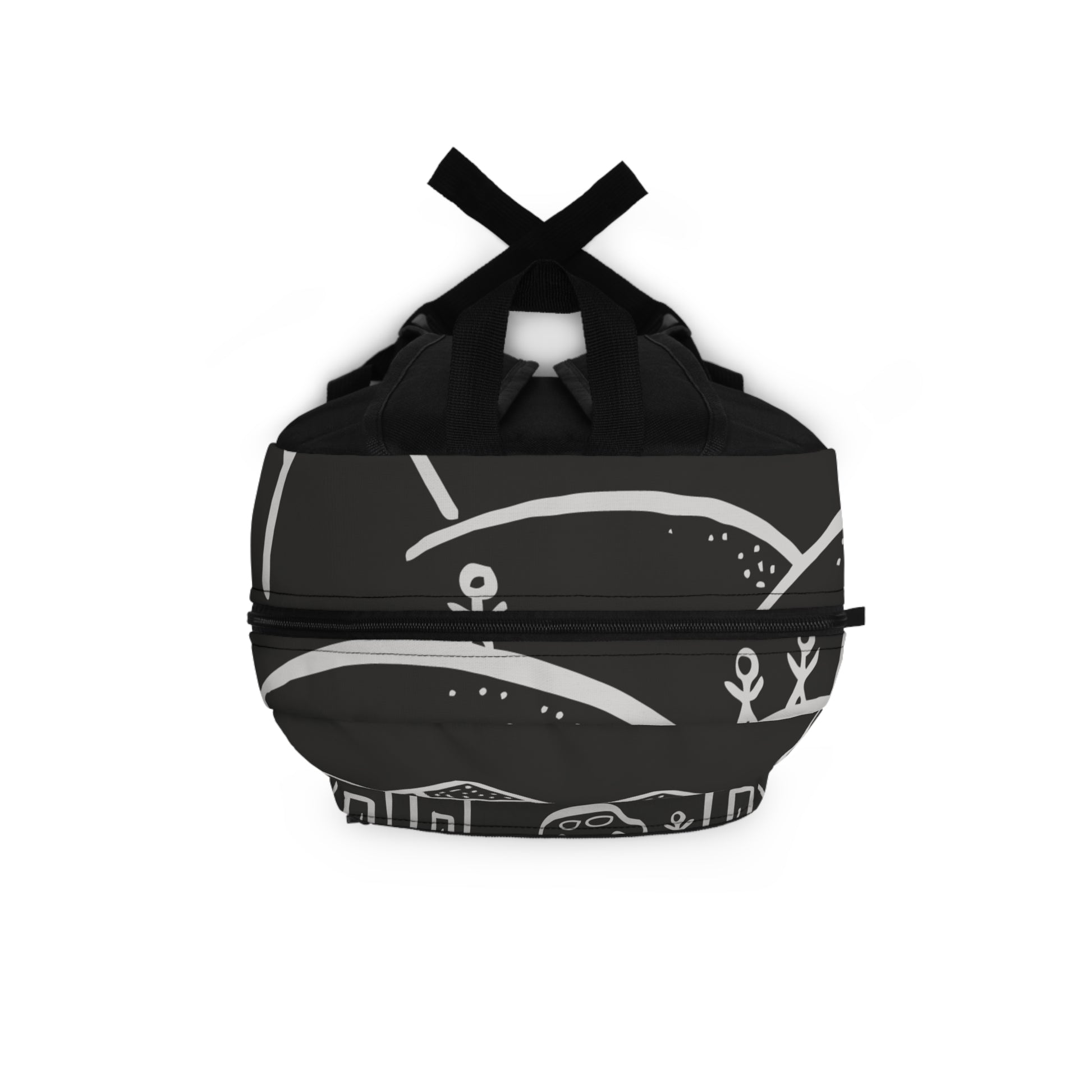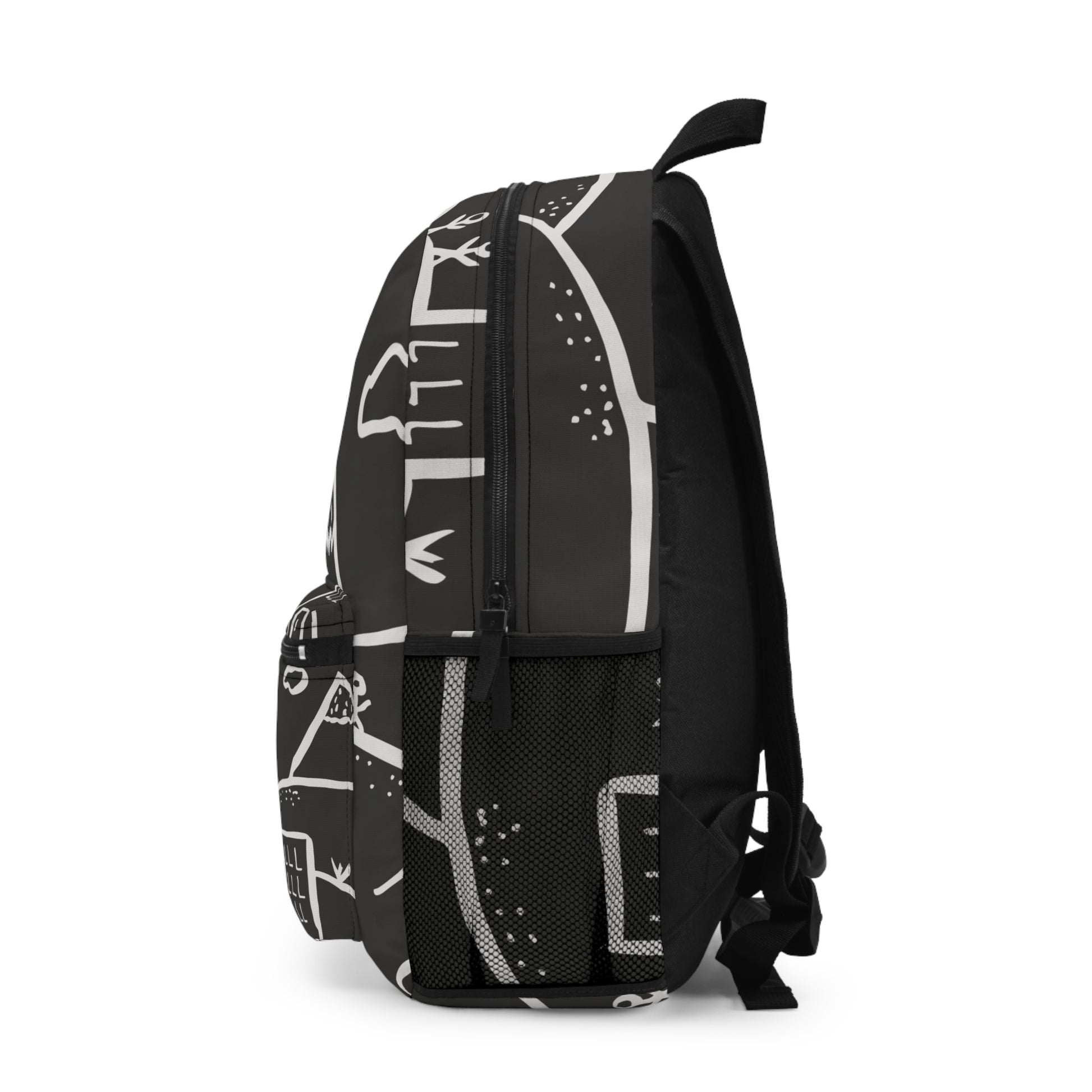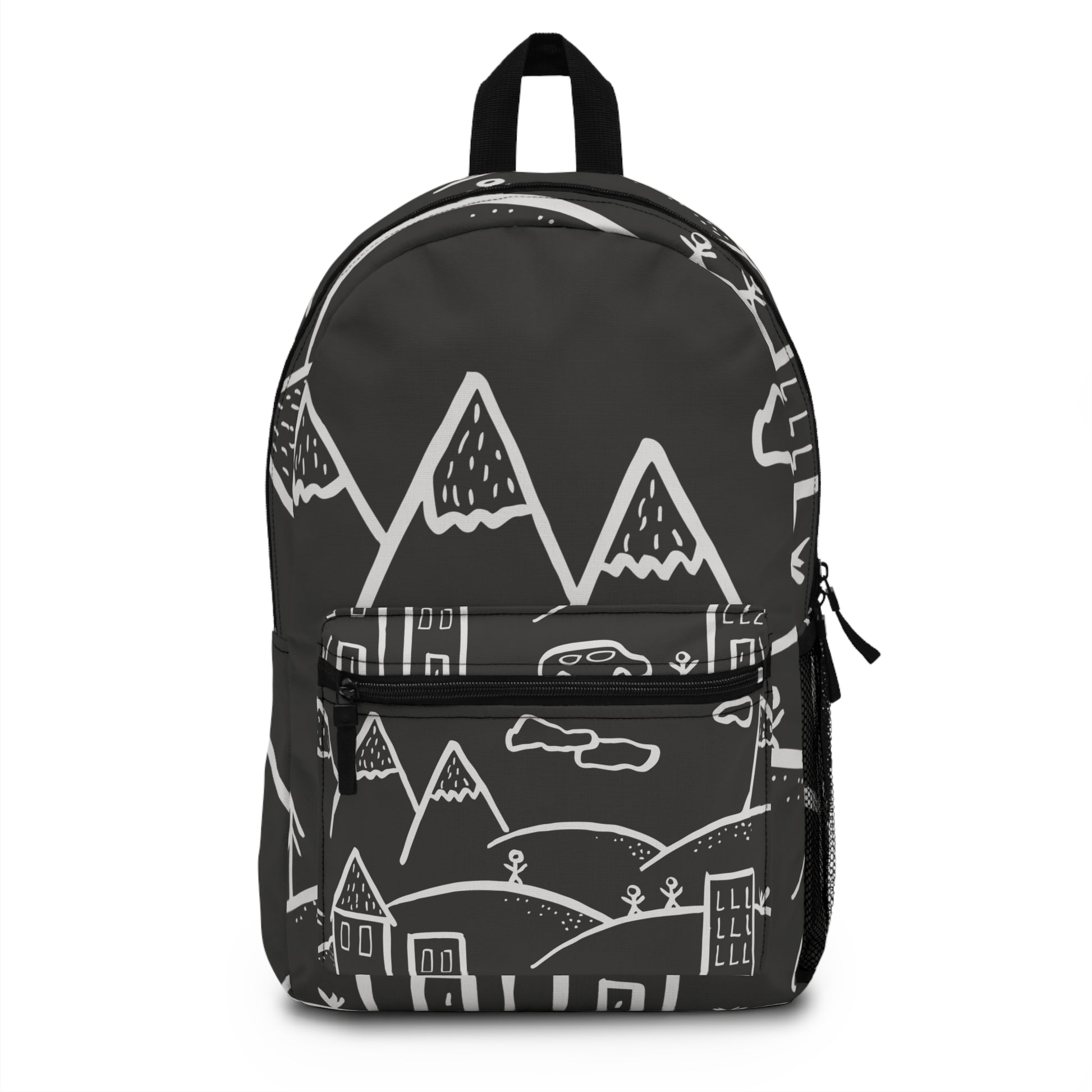 This charcoal backpack carries a hand-drawn mountain-and-town motif that feels like a sketchbook turned practical. Lightweight polyester keeps the bag resilient and dry, while a padded mesh back and adjustable straps make longer days comfortable. Multiple zip compartments, a sleeve for a tablet or laptop, and a side bottle pocket keep tools and snacks organized between classes, trails, or city streets. The subtle monochrome print reads modern and calm — it blends into everyday life while quietly expressing an adventurous, creative spirit.