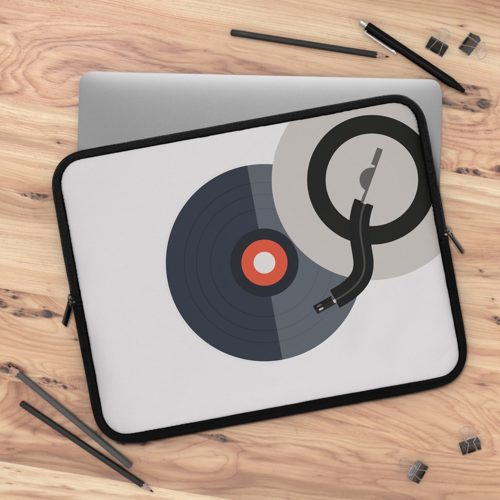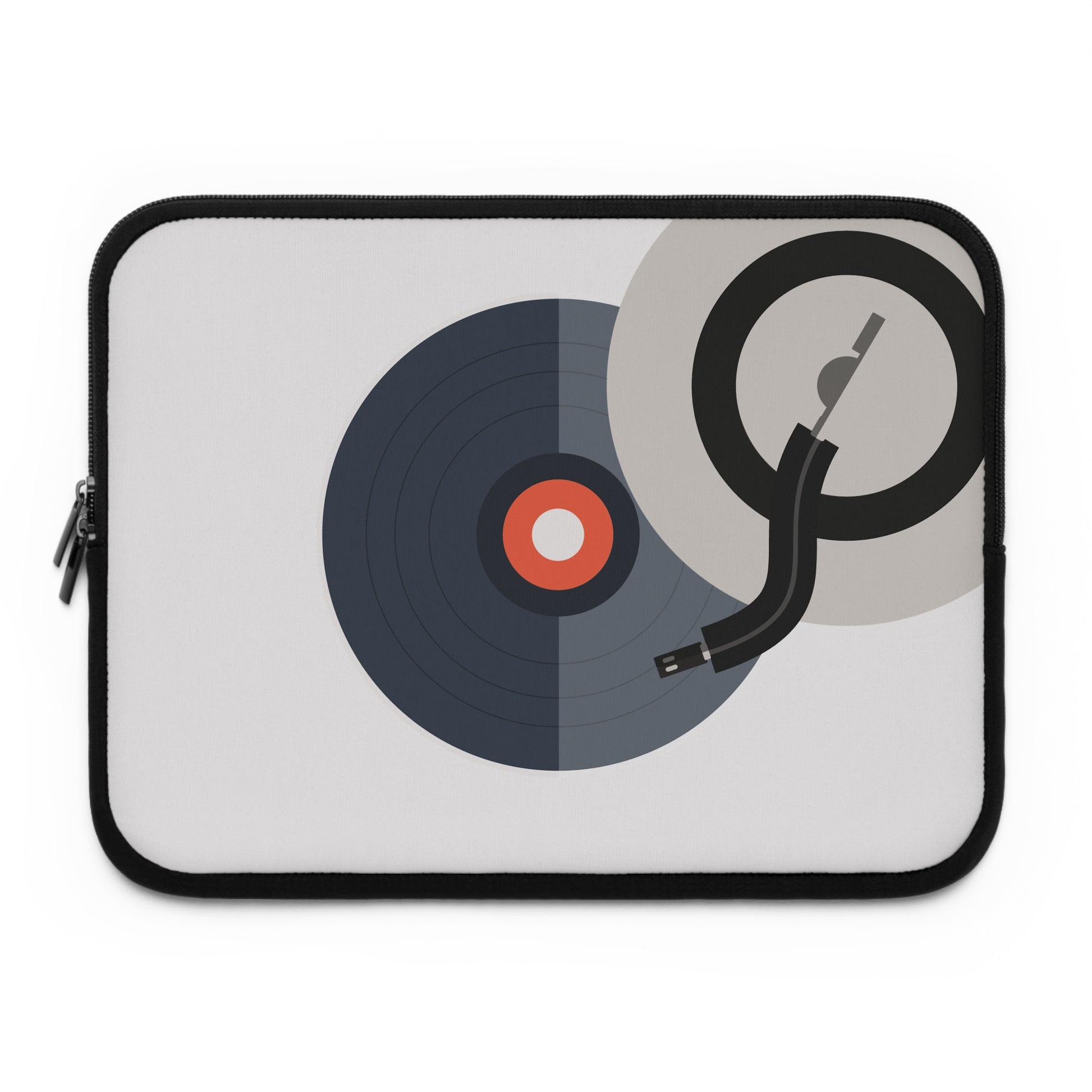 Soft, slim, and made for people who carry a little soundtrack with them. This neoprene laptop sleeve cushions your device with foam padding while a water-resistant exterior keeps light spills and the commute’s grit at bay. The front shows a clean, retro turntable graphic that nods to record lovers and DJs; the back stays solid black so it slips neatly into bags without fuss. Dual zipper pulls give fast, two-handed access, and multiple size options mean the sleeve fits a range of laptops and tablets. Lightweight and durable, it tucks into a backpack or under an arm while protecting your gear and expressing your music-loving style.