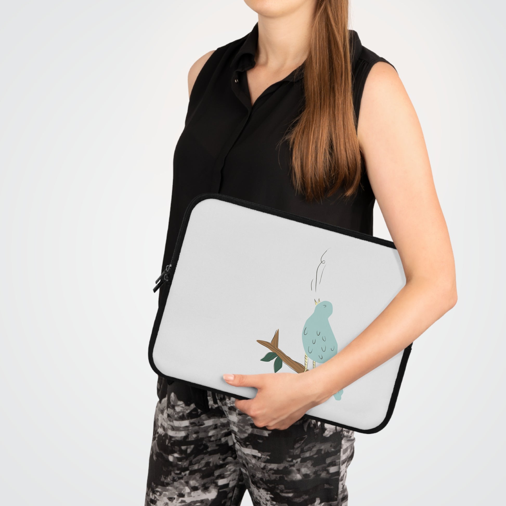 A soft neoprene laptop sleeve that brings a quiet moment of nature to your daily routine. The front features a hand-drawn, pastel bird perched on a twig — calm, simple, and slightly whimsical — set against a clean background with a solid black back. Lightweight yet cushioned, the sleeve absorbs minor bumps, resists water, and keeps dust at bay while two zippers glide smoothly for easy access. It slips into a tote or backpack and feels like a little pause between meetings, commute, and coffee breaks.