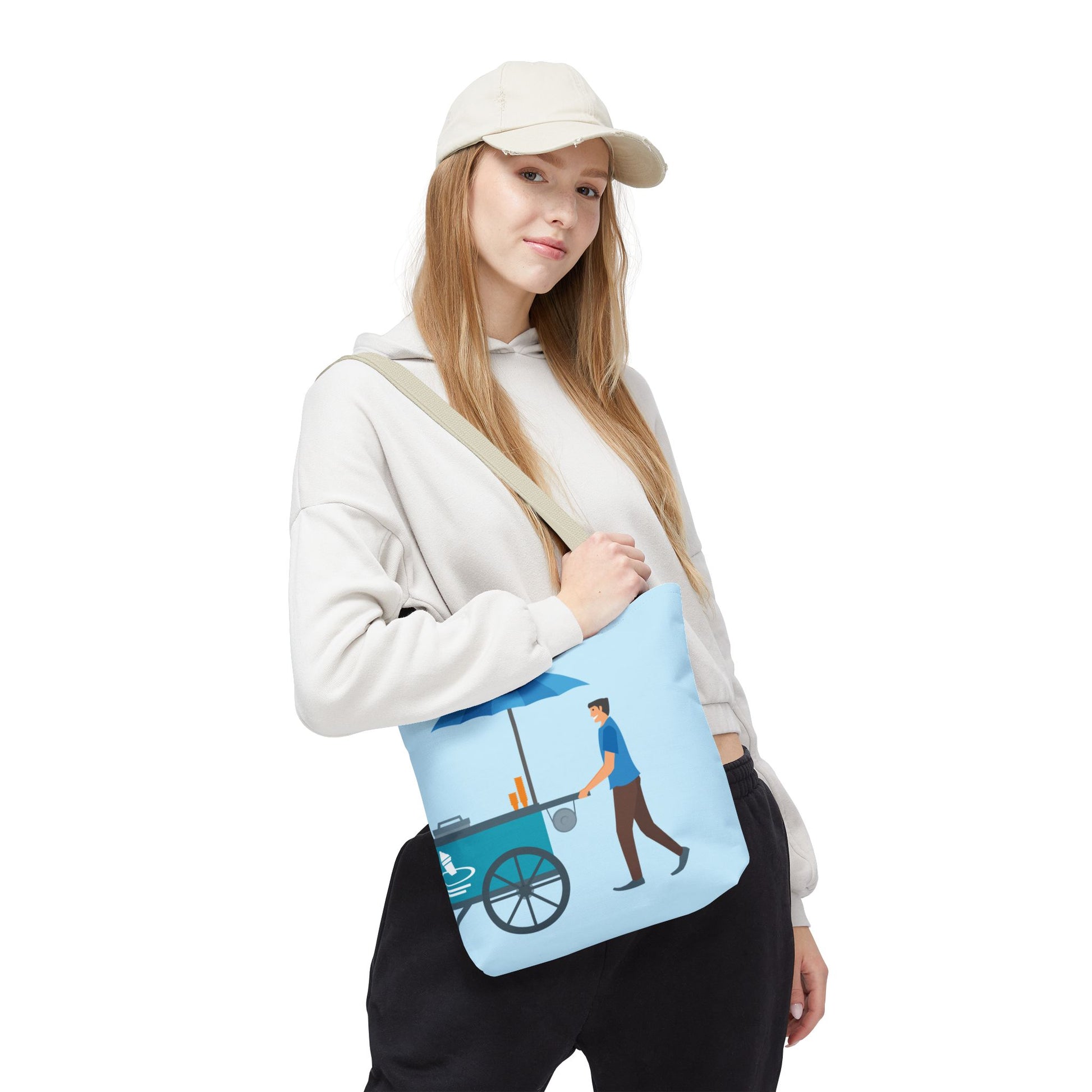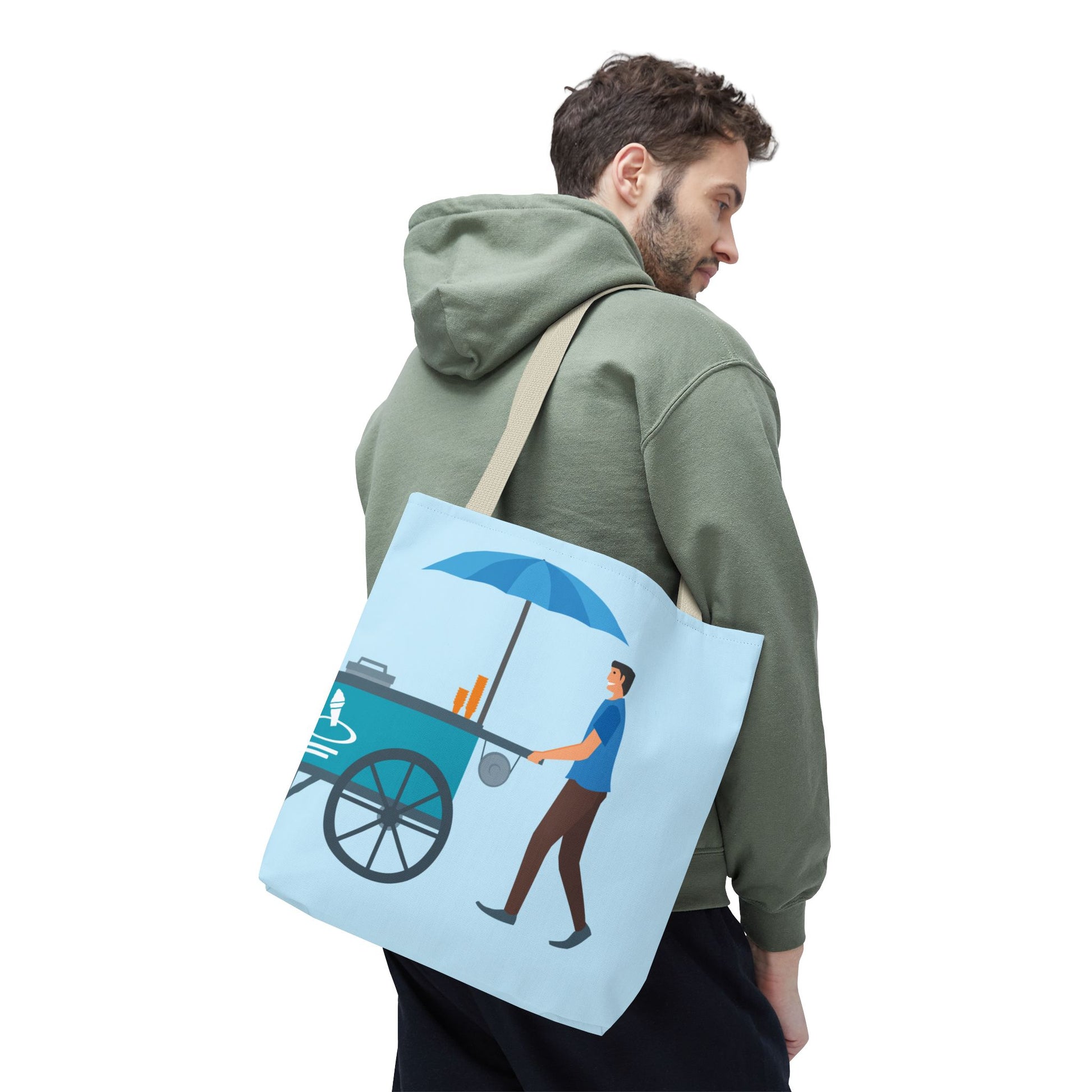 Light, bright, and quietly joyful — this tote carries a slice of street-side summer with you. A soft sky-blue canvas shows a vendor pushing a cart beneath a striped umbrella, a small everyday scene that feels familiar and kind. The roomy, boxed shape holds groceries, a sketchbook, or market finds without bulging, while the sturdy black handles and reinforced seams stand up to daily use. It’s the sort of bag you grab on a morning errand, tuck under your arm on a park walk, or bring along to a farmers’ market. The illustration is simple and calming, a small reminder of slower moments and honest work.